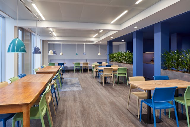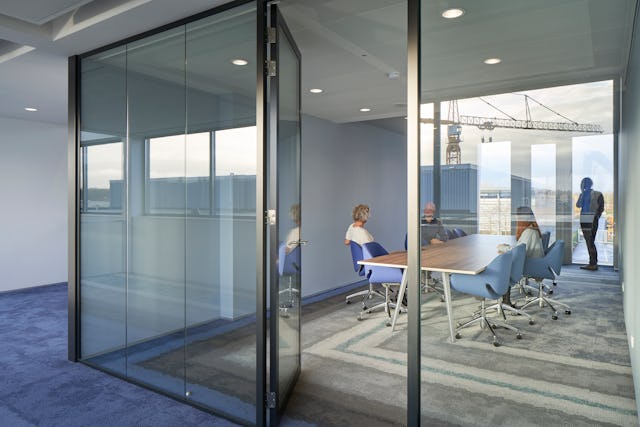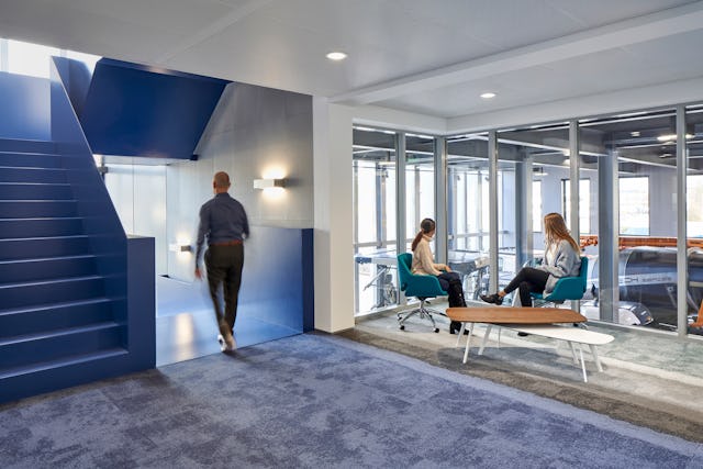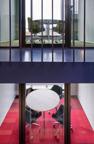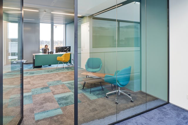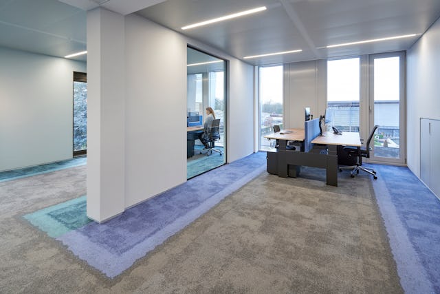 Tijdens een workshop met de medewerkers zijn vloercomposities ontworpen voor hun eigen toekomstige werkplek. De volledige Composure Edge vloertegel serie van producent Interface vormde hiervoor de basis. Om de composities, die uit de workshop voortkwamen, vloeiend te laten verlopen zijn speciaal voor dit project enkele overgangstegels geproduceerd. Dit heeft geresulteerd in eigenheid voor iedere afzonderlijke ruimte en een bonte schakering van kleuren op elke verdiepingsvloer. Dit wordt nog eens versterkt doordat de binnenwanden en stoffering van het meubilair in corresponderende kleuren met de vloertegels zijn uitgevoerd. Alle kantoorruimtes hebben ingebouwde kastenwanden die de kleur van de omgeving aannemen door de zilverglans afwerking van de deuren, met een rustig beeld als resultaat.