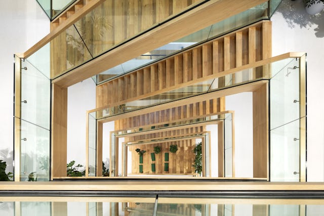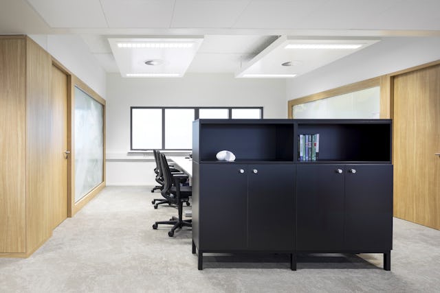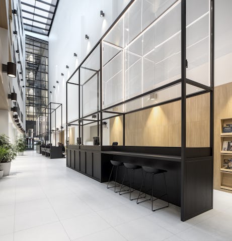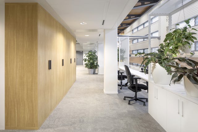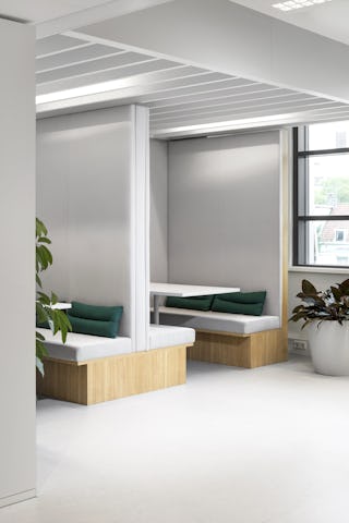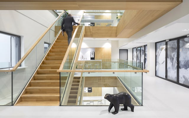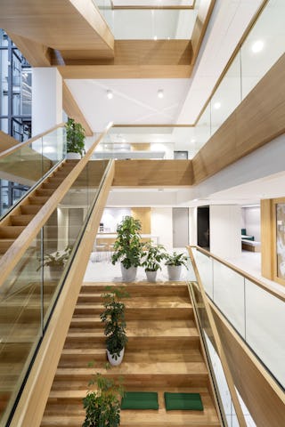 De centraal gepositioneerde verticale vide splitst de twee kantoorruimtes per verdieping in twee gedeelten. Vergaderruimtes, concentratieruimtes en belplekken zijn om-en-om gepositioneerd tussen de werkplekken, waardoor er een balans tussen openheid en geslotenheid ontstaat.