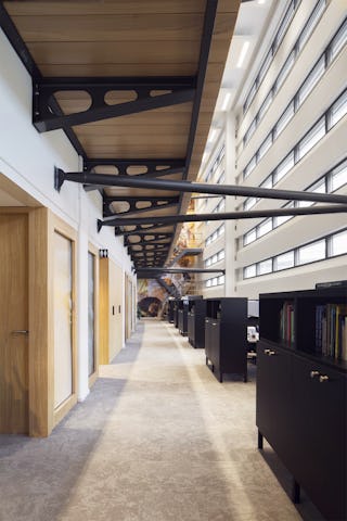 Het kantoor bestaat uit zes verdiepingen, ontsloten via een grote vide en trappenhuis. De begane grond bestaat uit ontmoetingsruimtes met collectiebalies, vergaderfaciliteiten, werkplekken en studieplekken. Via de grote podiumtrap in de vide worden de kantoorverdiepingen ontsloten. De centrale vide is ingericht als ontmoetingsgebied met vergaderfaciliteiten, pantries en zitnissen.
