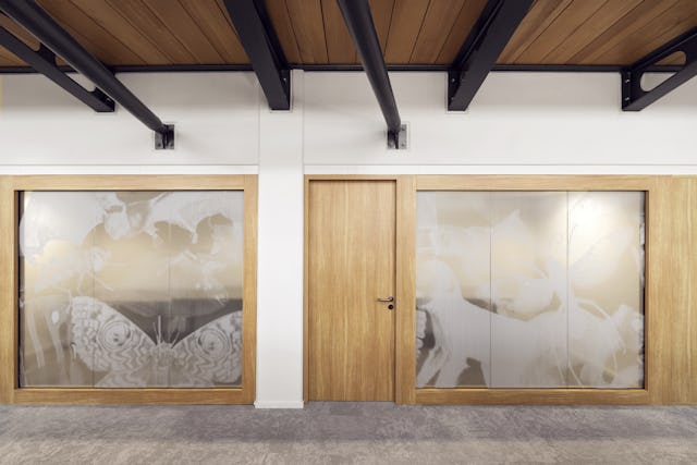 Het eenvoudige palet van eiken, wit, grijs en zwart is gecomplimenteerd door een grafische laag. Deze laag is in samenwerking met grafisch bureau Betiche speciaal ontworpen voor Naturalis. Deze grafische laag bestaat uit abstracte, kleurrijke prints die de collectie en de rijkdom van de natuur weergeven. En uit privacy folies voor de vergaderruimtes die een abstractie vormen van deze natuurlijke patronen en zo een herkenbare en toch subtiele verwijzing vormen naar de collectie van Naturalis.