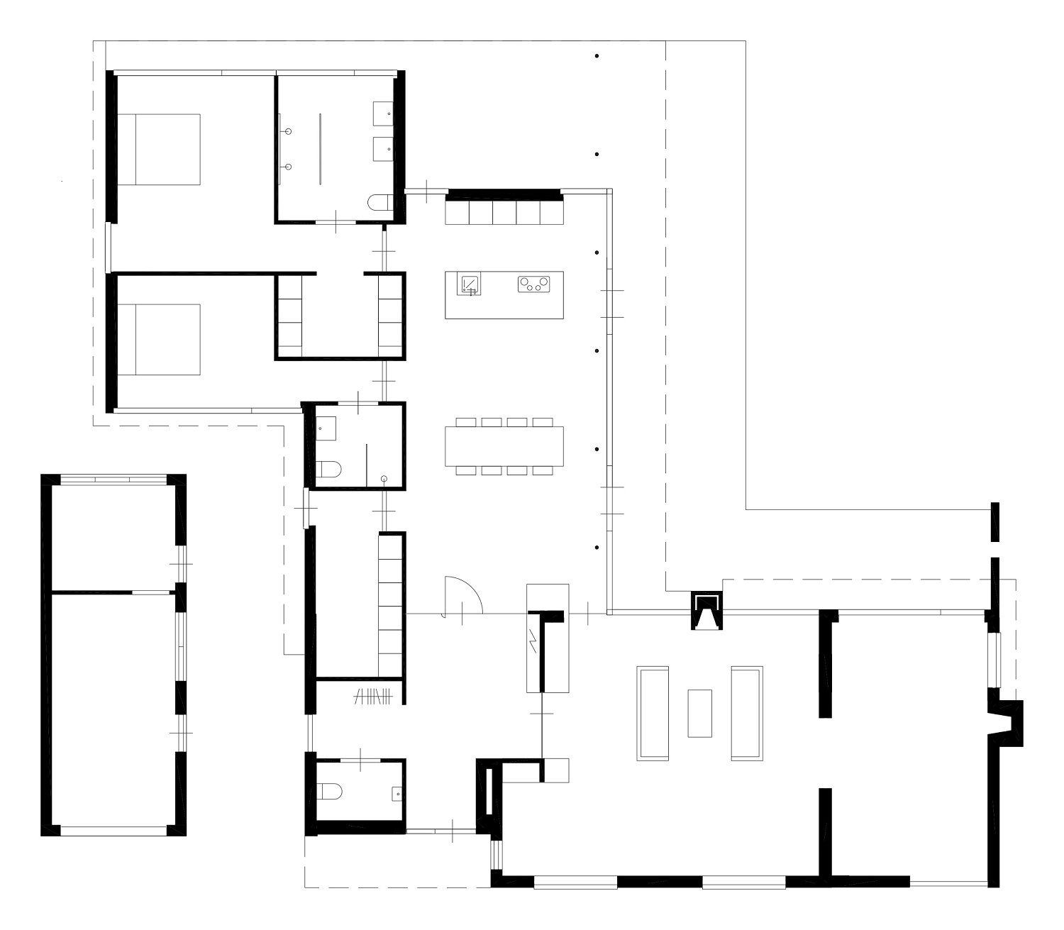 In de nieuwe situatie zijn voor- en achtervleugel op natuurlijke wijze verbonden door een lange wand die vanaf de voordeur naar achter loopt en die de blik van de bezoeker vanuit de entree automatisch in de richting van de tuin leidt. In de achtervleugel fungeert de wand ook als de scheiding tussen het privé-deel (slaapkamers en badkamers) en het meer publieke deel (keuken). De tegenoverliggende glazen wand biedt uitzicht op het groen buiten.