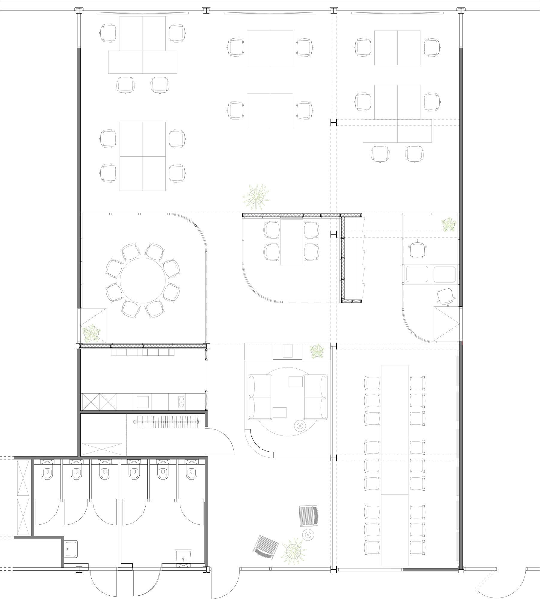 De werkzone is aan de gevelzijde van de studio gesitueerd en ontvangt daardoor het meeste daglicht. Door een slimme plaatsing van de stroompunten en armaturen zijn in deze ruimte zijn verschillende bureauopstellingen mogelijk, en kan het consultancy bureau rustig verder groeien. Er kan zowel staand als zittend gewerkt worden. In de materialisatie van dit ontwerp is uitsluitend gebruik gemaakt van duurzame bouwmaterialen, stoffering en verlichting.