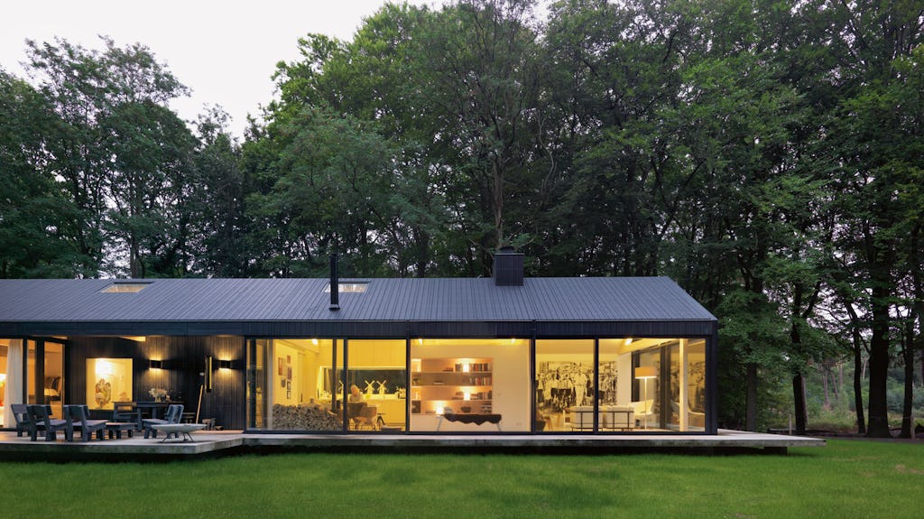 De verticale ruwhouten bekleding heeft een ritmisch patroon, dat doorloopt over de gevel- en dakvlakken. Het hout is met roestvrijstalen nagels respectievelijk schroeven op de onderconstructie bevestigd. Ook de halfronde koppen van de nagels en schroeven vormen een subtiel patroon. Een aantal elementen is doelbewust verborgen of zo terughoudend mogelijk gedetailleerd, zoals de goten, de hemelwaterafvoeren en de aluminium waterslagen. De west- en zuidgevel van het huis bestaan grotendeels uit glas. Dit zorgt voor een ongestoorde visuele verbinding met het landschap. “Zwart aan de buitenkant, licht vanbinnen”, en voldoende wandoppervlak voor twee grootformaat schilderijen, zo omschrijven de opdrachtgevers de essentie van de opzet. De ruimten zijn lineair geordend en bestaan uit vernauwingen en ver- bredingen binnen het grote volume van de ‘hal’. Woonkamer, eetkeuken en studio worden alleen door vrij in de hal staande kubussen en glas tussen de onderzijden van de dakvlakken van elkaar gescheiden. Doorzichten maken de lengte van het huis voelbaar en vormen een frame voor het landschap. Dit zijn ruimtelijke strategieën die vaker zijn toegepast, bijvoorbeeld in Glenn Murcutts Frederick Farmhouse, en die wellicht geïnspireerd zijn op de adellijke en burgerlijke enfilades. Dit huis neem je waar door je er doorheen te bewegen. De basis van het interieur bestaat uit drie materialen en kleuren: grijs gietbeton (vloer), crème-wit pleisterwerk (wanden) en met een witwaas behandeld vurenhout (kolommen, spanten, balken en latten). Deze terughoudendheid in materiaalgebruik en de uitgekiende detaillering van, bijvoorbeeld, de matglazen vensterbanken, de ledverlichting tussen de balken, de in de kubussen geïntegreerde kasten en planken en een deur die, eenmaal geopend, nagenoeg wegvalt in het wandvlak, versterken de ruimtewerking.