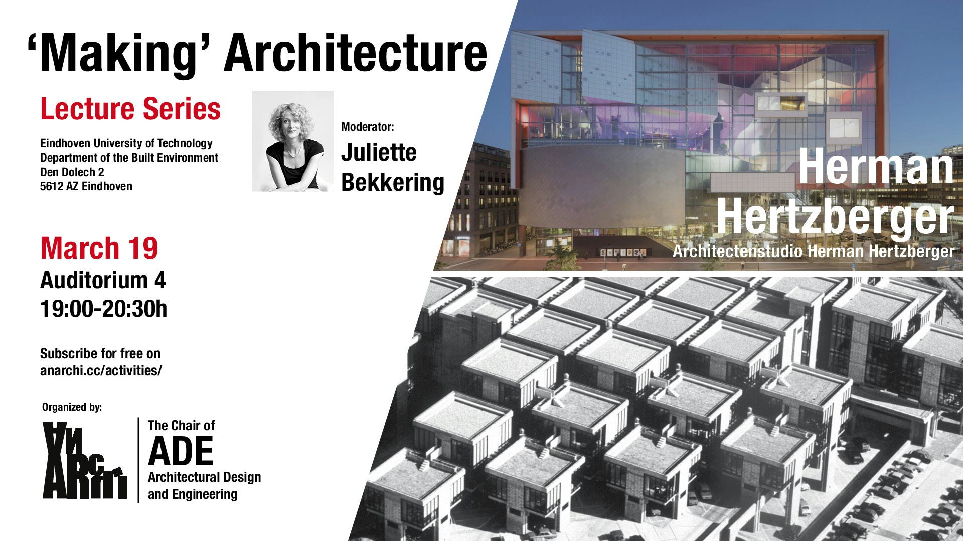 Herman Hertzberger zal hiertoe in zijn lezing een aantal projecten uitlichten die het proces van het maken, van concept tot gebouw, illustreren. De lezing vindt plaats in Auditorium zaal 4 op het terrein van de TU Eindhoven. Aanmelden is gratis via ir@anarchi.cc. TU/e studenten kunnen zich aanmelden via https://www.anarchi.cc/activities