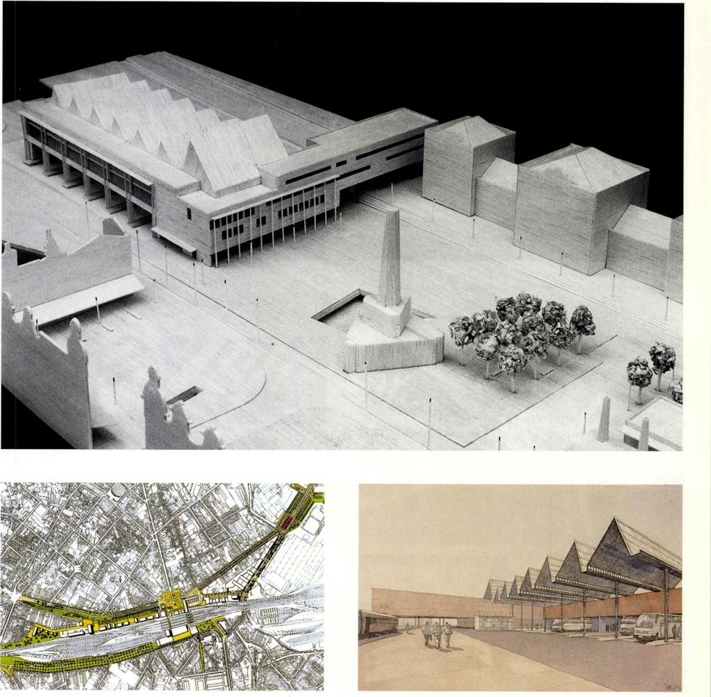 Boven: Herinrichting Stationsplein Leuven. Ontwerp: Manuel de Sola-Morales, Linksonder: Stationsomgeving Leuven. Ontwerp: Projectteam Stadsontwerp K.U. Leuven, landschapsarchitect: Michel Desvigne. Het noordelijke deel is in uitvoering, met de aanleg van de verkeerstunnel, de ondergrondse parking en de herinrichting van het stationsplein, Rechtsonder: Nieuw busstation dat aansluit op voetgangerstunnel naar Kessel-Lo. Ontwerp: Manuel de Sola-Morales.