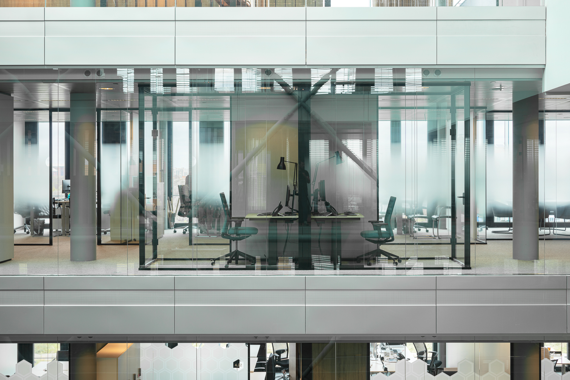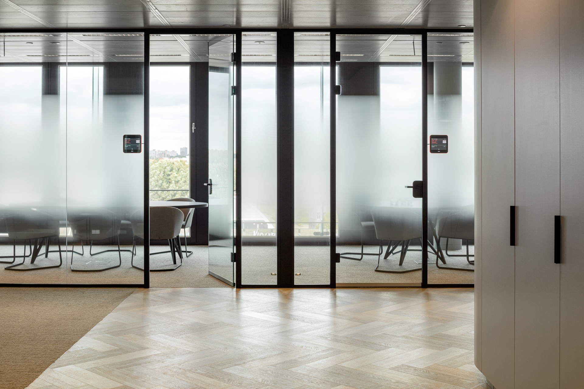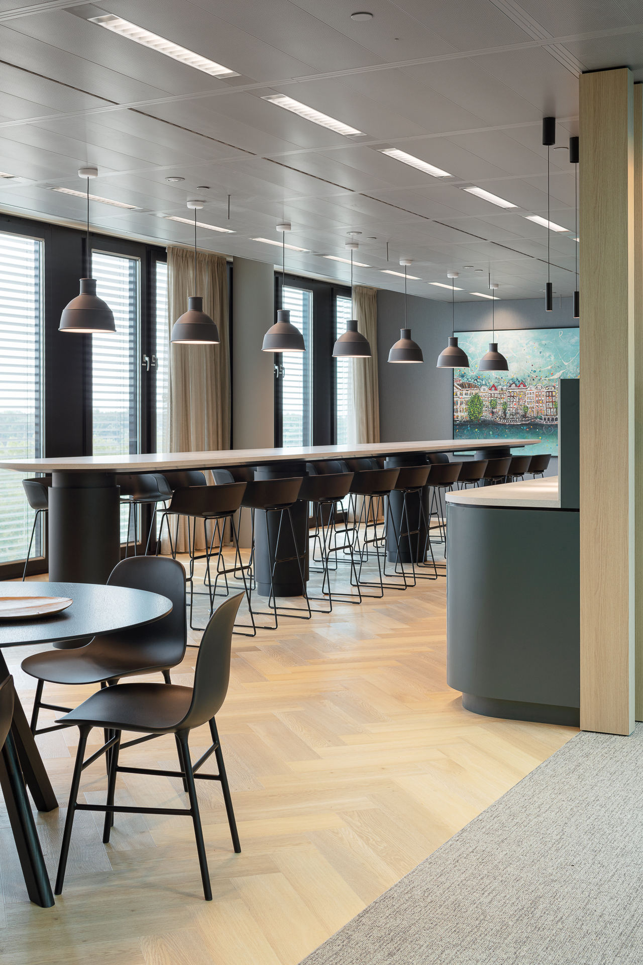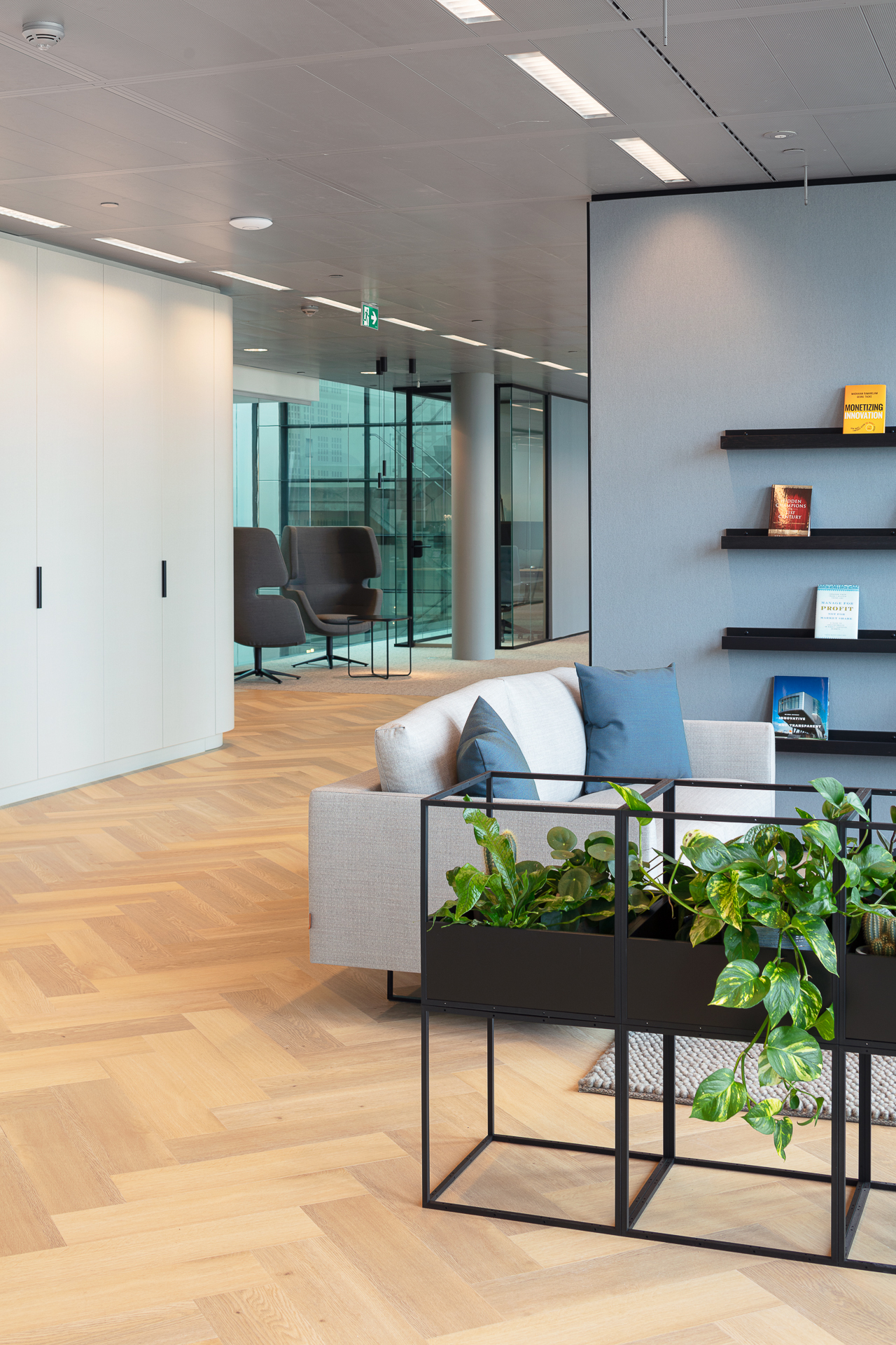 Toelichting DZAP - Het markante kantoorgebouw biedt met zijn enorme hoeveelheid glazen wanden en meerdere binnentuinen een mooie ontwerp-uitdaging. Uit het architecten-café kwam duidelijk naar voren dat zij op zoek waren naar een kantoor dat voelt als een warme en chique huiskamer en tegelijk een professioneel, ruimtelijk en zakelijke uitstraling heeft.