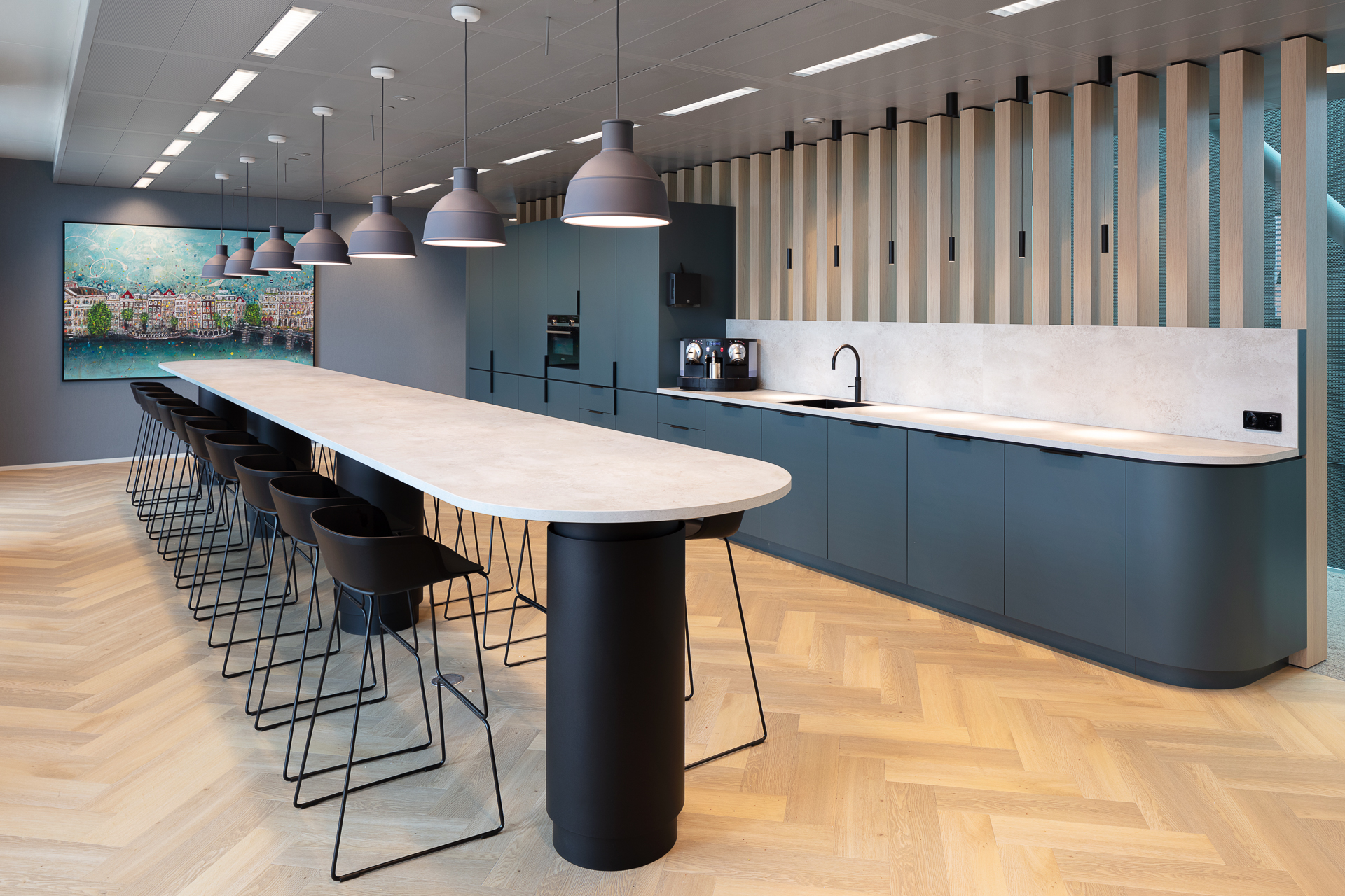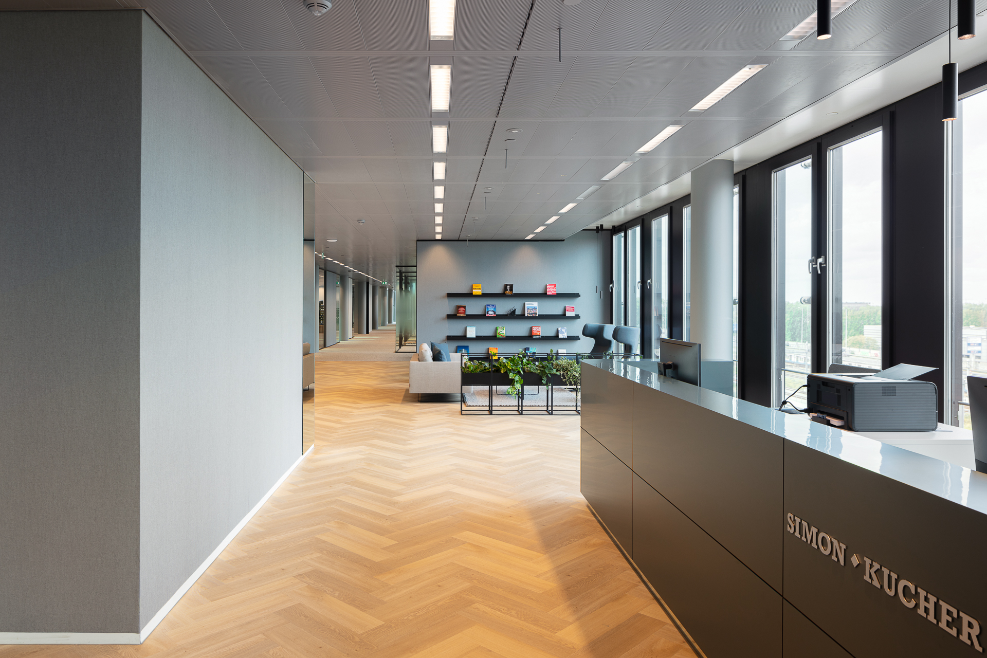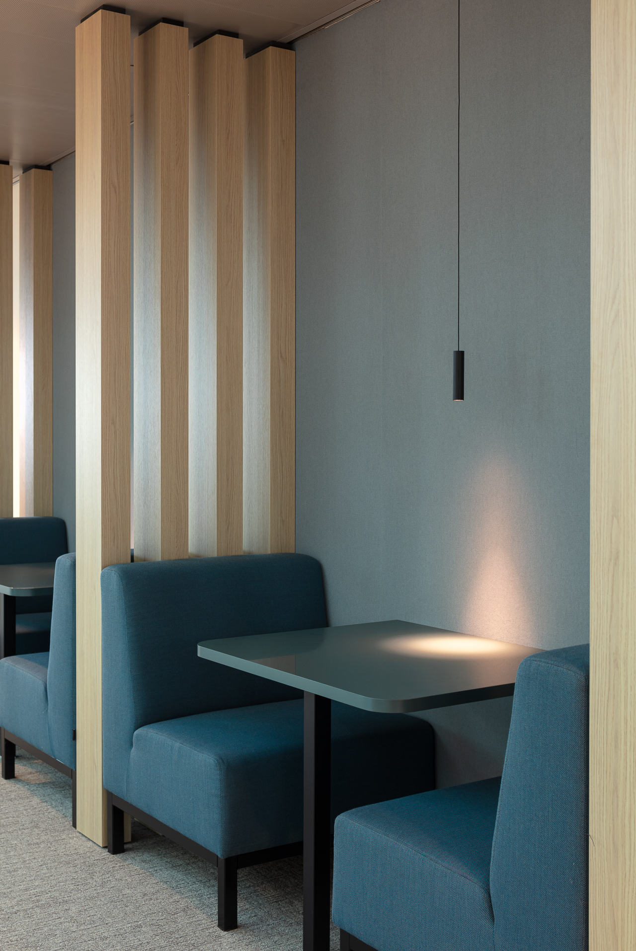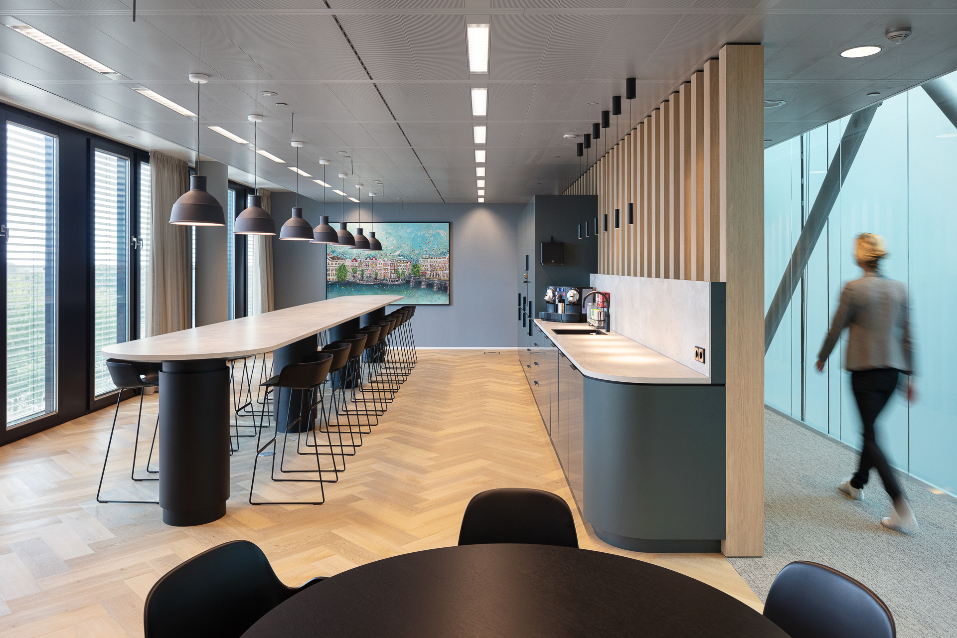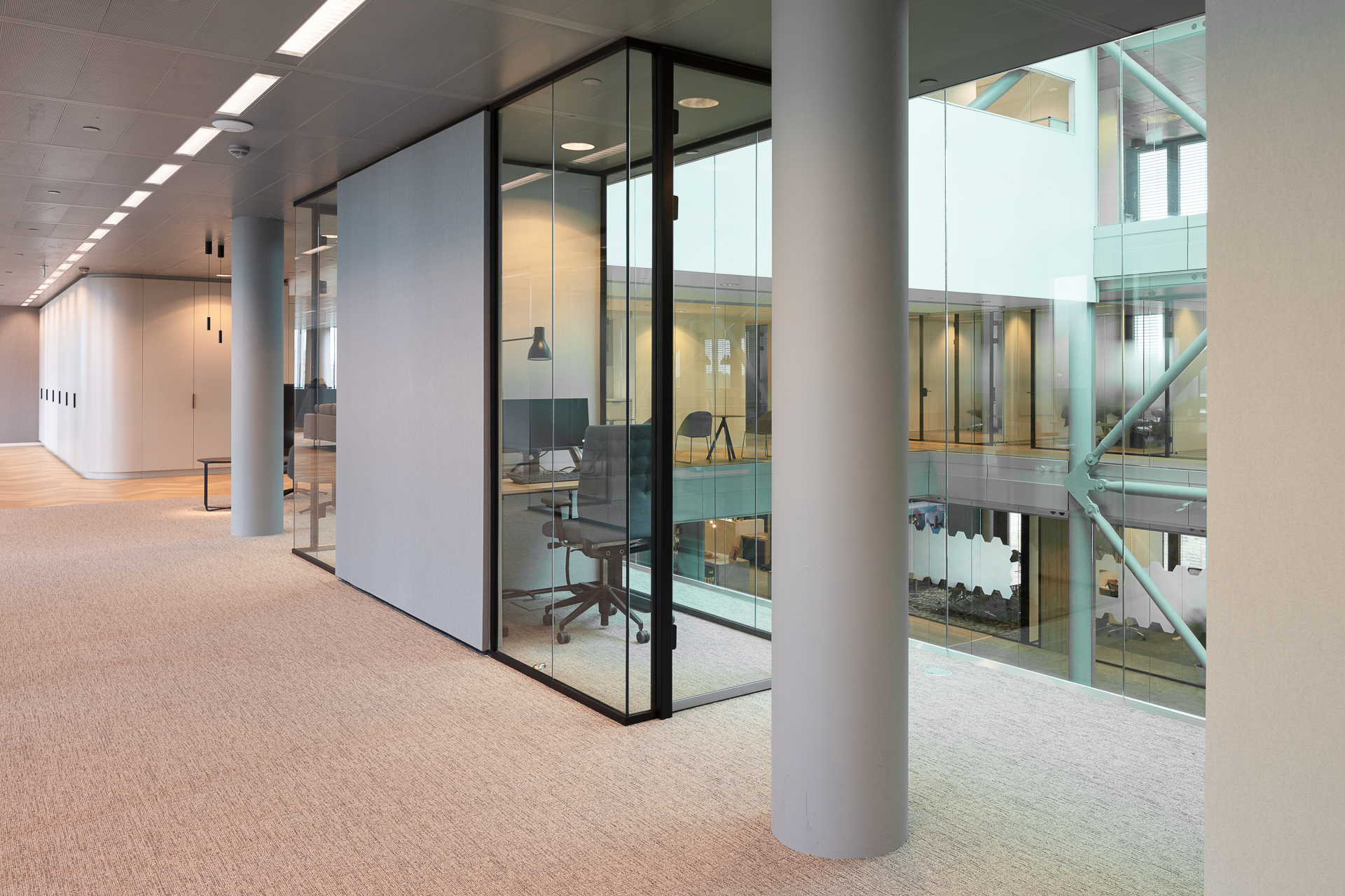 In het ontwerp hebben wij het ruimtelijke gevoel van het kantoor versterkt door optimaal gebruik te maken van het centraal gelegen atrium. Hierbij zijn bel-cellen, werkplekken en zitjes zo goed als tegen het atrium aan geplaatst en wordt de ruimtelijke werking optimaal benut. De open ruimten worden afgewisseld met gesloten kantoren en vergaderruimten. En door het gebruik van zachte en warme kleuren uitgevoerd in mooie materialen heeft het kantoor een warme en zakelijke uitstraling gekregen.
