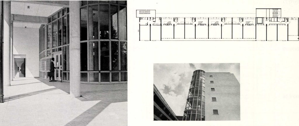 Dank zij de uitgekiende opbouw en stapeling van de woningen heeft het hoogbouwblok slechts om de drie lagen een ontsluitende galerij nodig. De lift stopt alleen op de galerijverdiepingen. De woningen die zo gestapeld zijn dat er wel op iedere laag een ingang nodig is, liggen direct aan het hoofdtrappenhuis of aan het tweede trappenhuis. Deze woningen kunnen dan vanuit de lift bereikt worden door met de trap nog één verdieping te stijgen of te dalen. De trappenhuizen zijn zo transparant mogelijk gehouden, onder andere als preventief middel tegen vandalisme. Hetzelfde geldt voor de twee gemeenschappelijke ruimtes op de begane grond. Vanuit deze ruimtes kan het terrein tussen de hoogbouw en de parkeergarage overzien worden. De parkeergarage heeft trouwens op de begane grond een afsluiting gekregen die afwisselend uit glazen bouwstenen en hekwerk bestaat. Deze afsluitende wand is ook door Mecanoo ontworpen. Behalve de gemeenschappelijke ruimtes op de begane grond heeft de hoogbouw ook nog een ruim dakterras dat voor alle bewoners toegankelijk is. Twee Corbusiaans-aandoende betonwanden zorgen voor beschutting tegen de wind.