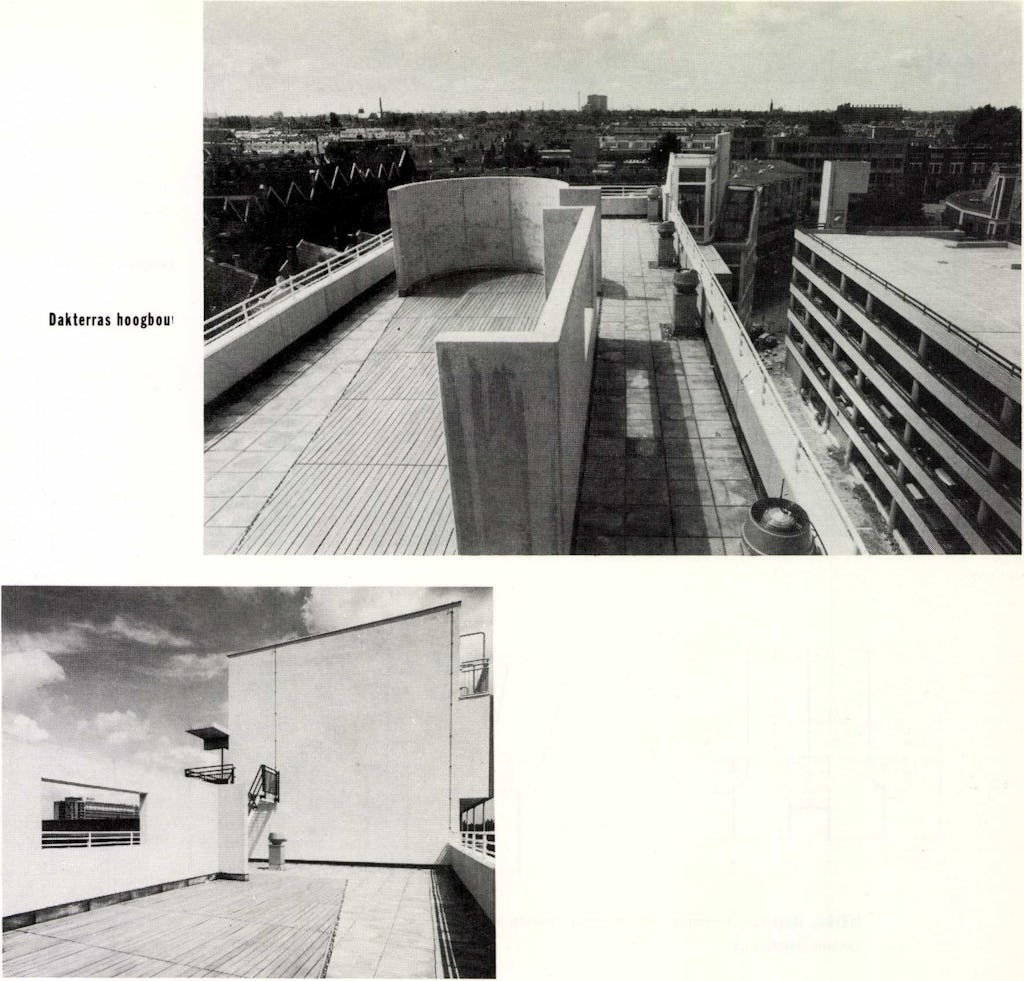 De galerijen hebben een dak gekregen dat uit dezelfde elementen is opgebouwd als de galerij zelf: betonnen platen opgelegd op consoles. Door dit massieve dak worden de galerijen sterke plastische elementen in de noordgevel. Het is alsof ze er als kokers tegenaan zijn gehangen. Ook is er hierdoor een sterk besloten karakter ontstaan, dat nog versterkt wordt door de balusters van het hekwerk die over de volle galerijhoogte doorlopen. Het vreemde aan deze opbouw van het galerijdak is dat op de galerij zelf de indruk wordt gewekt dat de volgende verdieping een eigen ontsluiting heeft. En dit is dank zij de slimme stapeling van de woningen nu juist niet het geval.