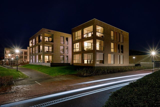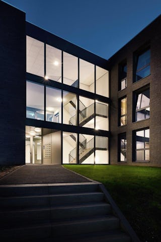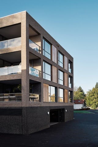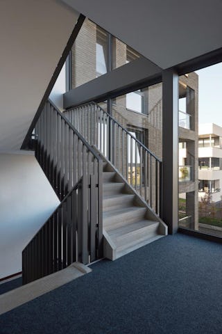 De bovenbouw wordt gerealiseerd in een lichtere steen, afgewisseld met houten vlakken en grote raampuien, die het gebouw een warme en lichte uitstraling geven.