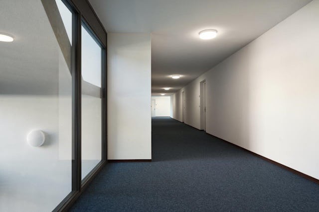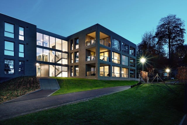 Het gebouw heeft een donkere plint, gelijk aan de andere appartementencomplexen, die voor het grootste deel in de helling is geplaatst, zodat het parkeren aan het oog wordt onttrokken.