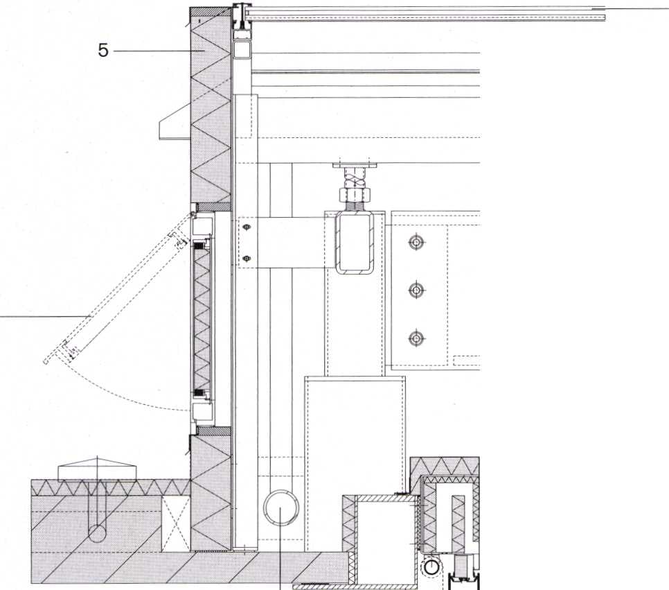 1 beloopbaar glas 2 stalen afvoergoot 3 kassendoek als zonwering 4 samengestelde staalkoker 8x50 cm 5 rvs sanwichpaneel 6 klep tbv ventilatie 7 sprinklerleiding 8 binnenwandsysteem Unispace 9 leidingenzone 10 bouwkundige suskast tbv overstort 11 staalkolom 12 parallel uitzetdeel 13 computervloer 14 Wingvloer 15 stalen petligger 16 binnenwand flushglazing 17 draaibare lamellen 18 eikenhouten parket 19 vloerverwarming 20 kanaalplaatvloer