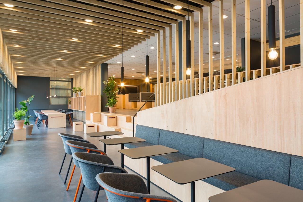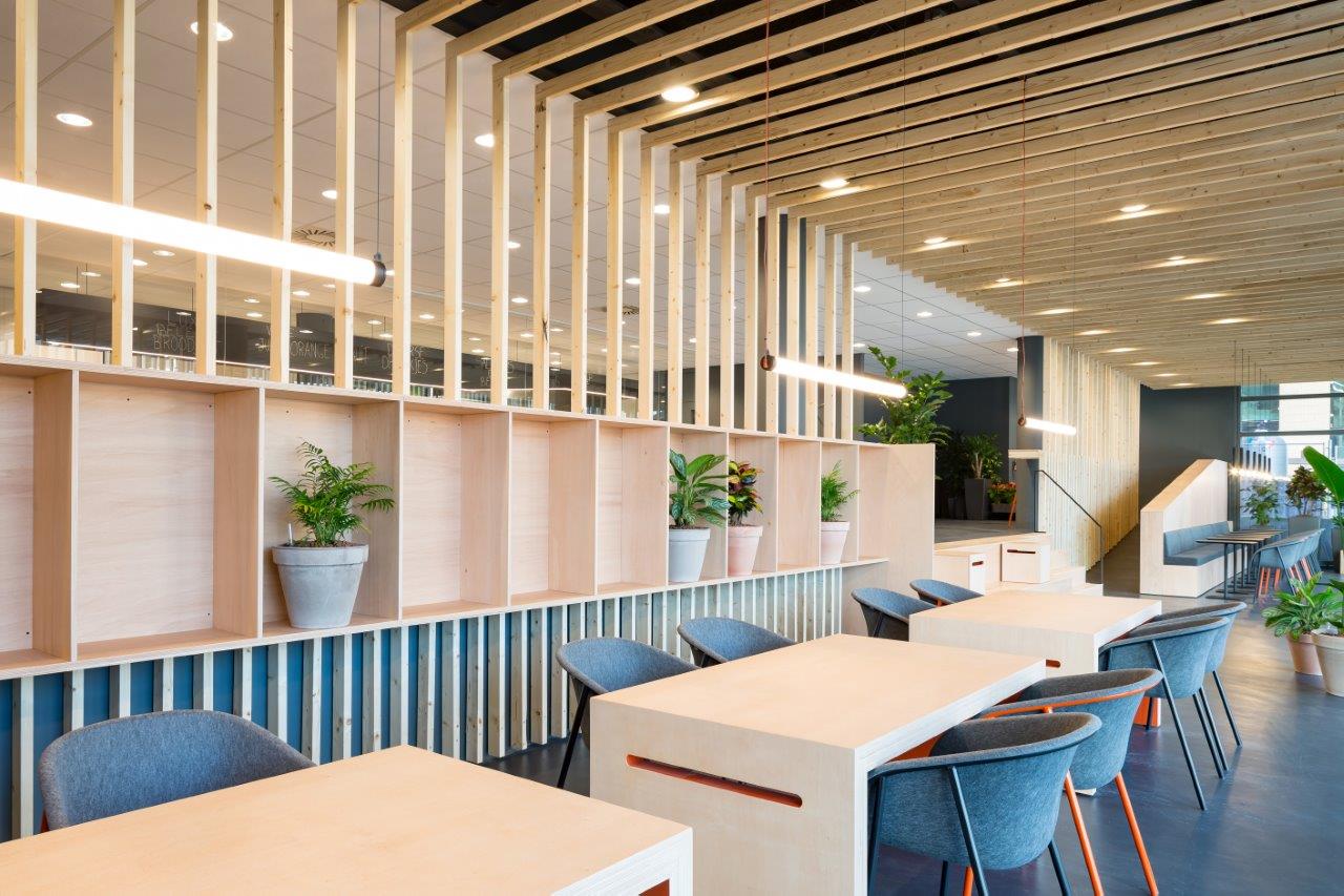 Het duurzame en circulaire interieur van Stadsdeelkantoor Buikslotermeerplein is eenvoudig en eerlijk. Het past perfect bij het stoere, ongegronde Amsterdam-Noord gevoel. "We zijn geïnspireerd door het unieke karakter van Amsterdam-Noord waar 'Maken' centraal staat", aldus architect Daniël Peters. “Waar mensen vroeger op de scheepswerven werkten, experimenteren ze nu met stadslandbouw en het 3D-printen van huizen en bruggen. Die initiatieven hebben Amsterdam-Noord op de kaart gezet.” Met basismiddelen als constructiehout, primer, gerecyclede PET-flessen en veel planten creëerde DAMAST een inspirerende werkomgeving.