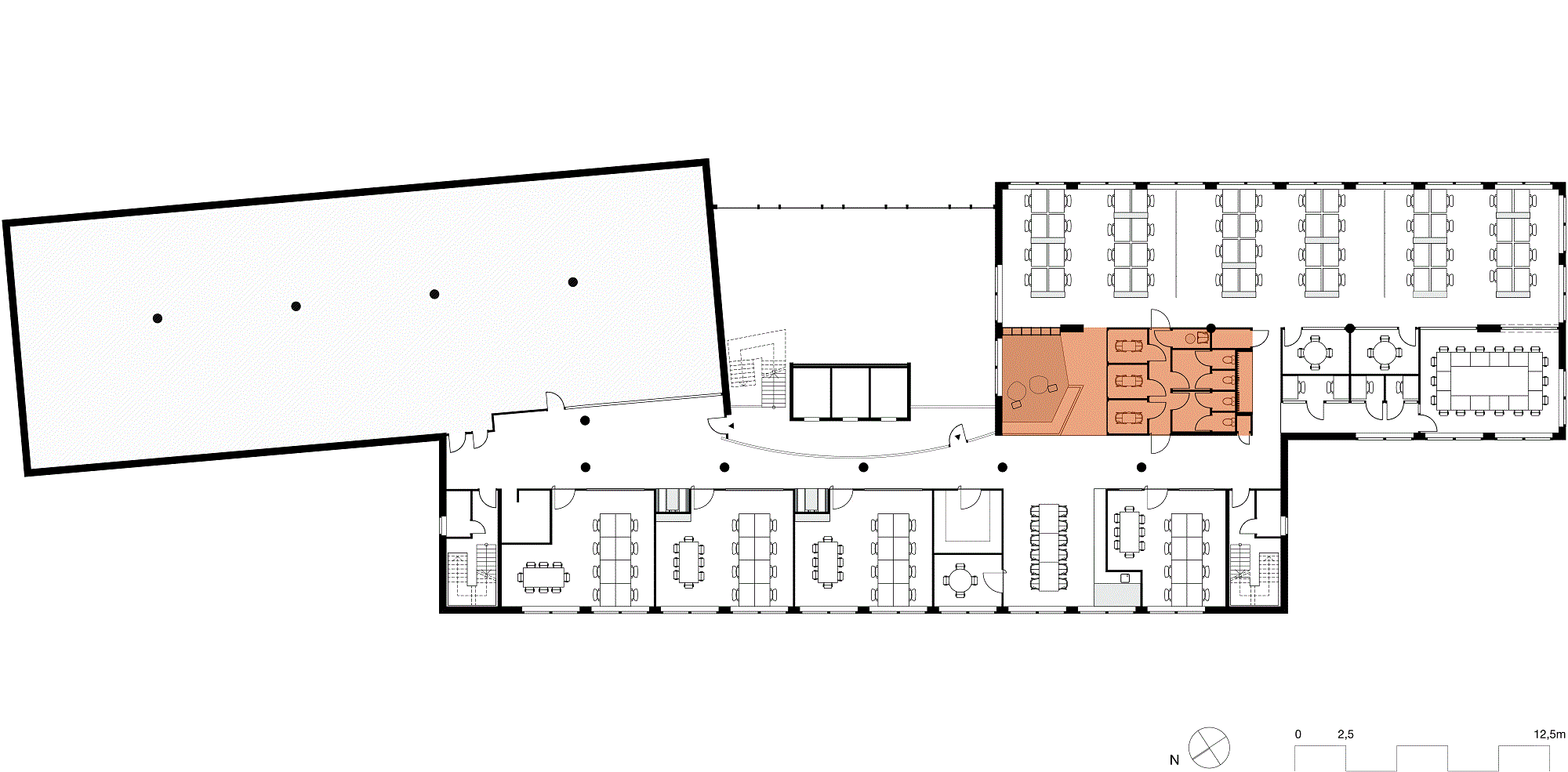 Met tal van initiatieven en experimenten vormt het gebouw het facilitere hart van alle nieuwe ontwikkelingen in de wijk. Duidelijke routes en zichtlijnen zorgen voor een rustige en comfortabele werkomgeving met een verscheidenheid aan plekken. De superflexzone bevat comfortabel uitgeruste werk- en loungeruimtes en flexibele ruimtes voor projectmatig werken. Het restaurant is een Plaza, waar men zich thuis voelt en ook kan vergaderen. DAMAST is erin geslaagd om met minimale middelen een uitnodigende werklocatie en visitekaartje in één te creëren.