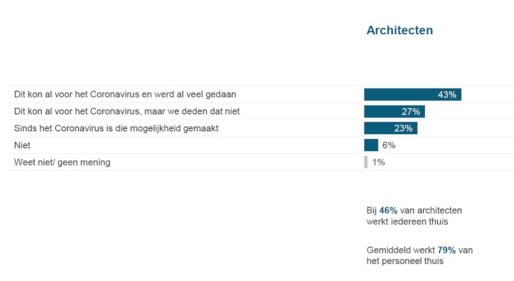 Het beeld dat architecten vrij moeiteloos de overgang naar thuiswerken hebben gemaakt, wordt in het onderzoek bevestigd. Bij 46% van de bureaus werkt alle personeel thuis. Gemiddeld blijkt bijna tachtig procent van het personeel thuis te werken.