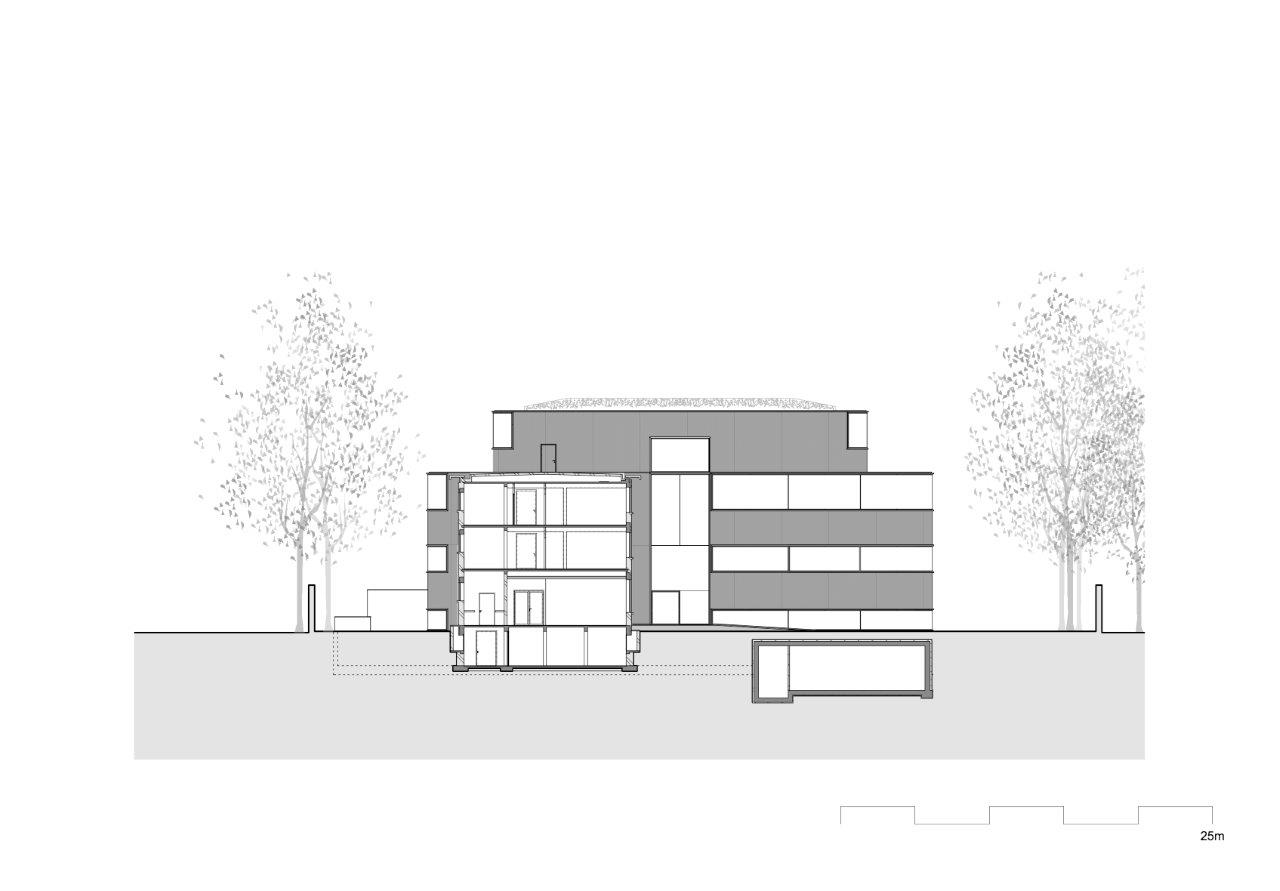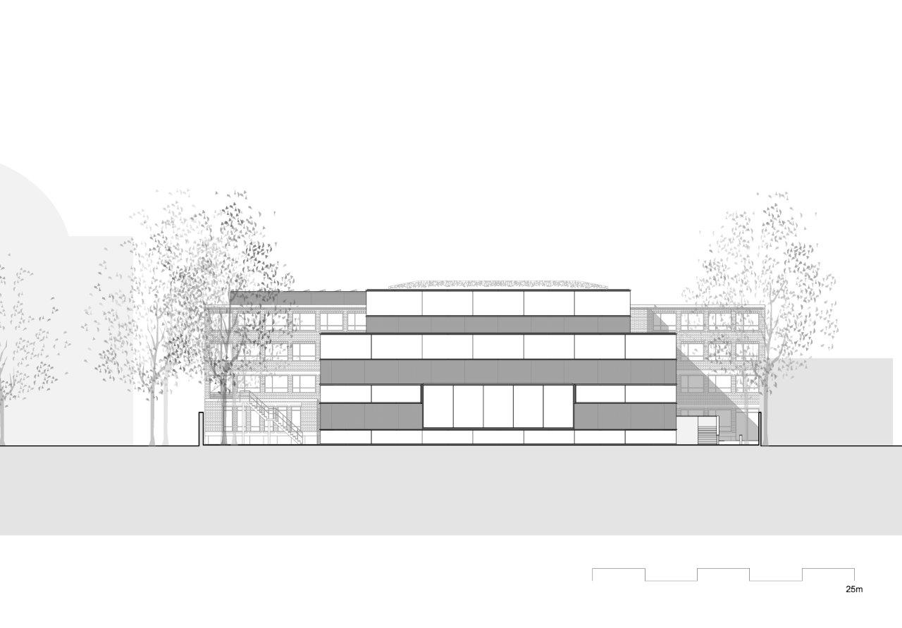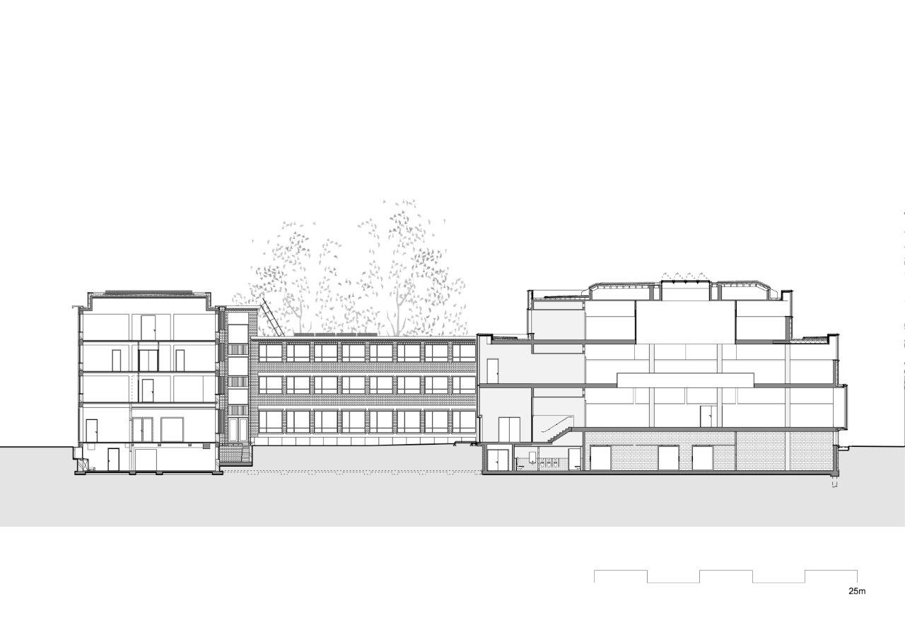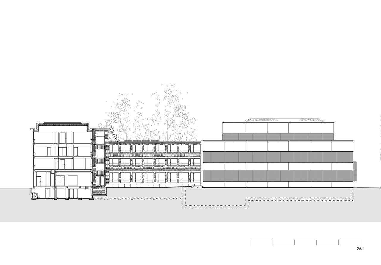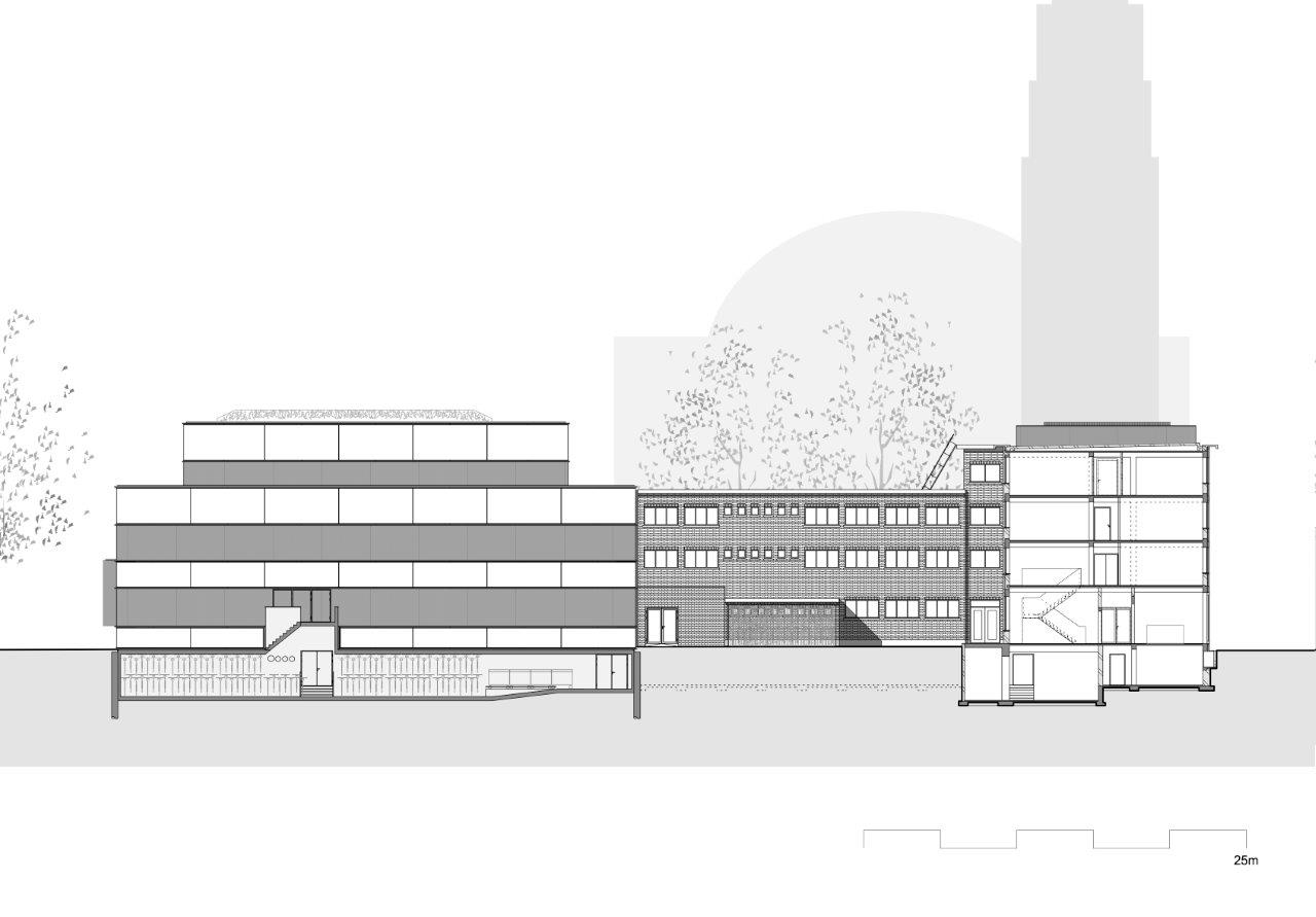 Omdat het budget geen volledige sloop van het bestaande huis toeliet, besloot Atelier Kempe Thill te kiezen voor een gecombineerde strategie van gedeeltelijk hergebruik, gedeeltelijk transformatie en gedeeltelijke afbraak om ruimte te maken voor een substantiële nieuwe uitbreiding van het instituut. Het hoofdgebouw langs de straat en de zijvleugel werden behouden, terwijl de twee kleinere auditoria aan de tuinzijde werden gesloopt.