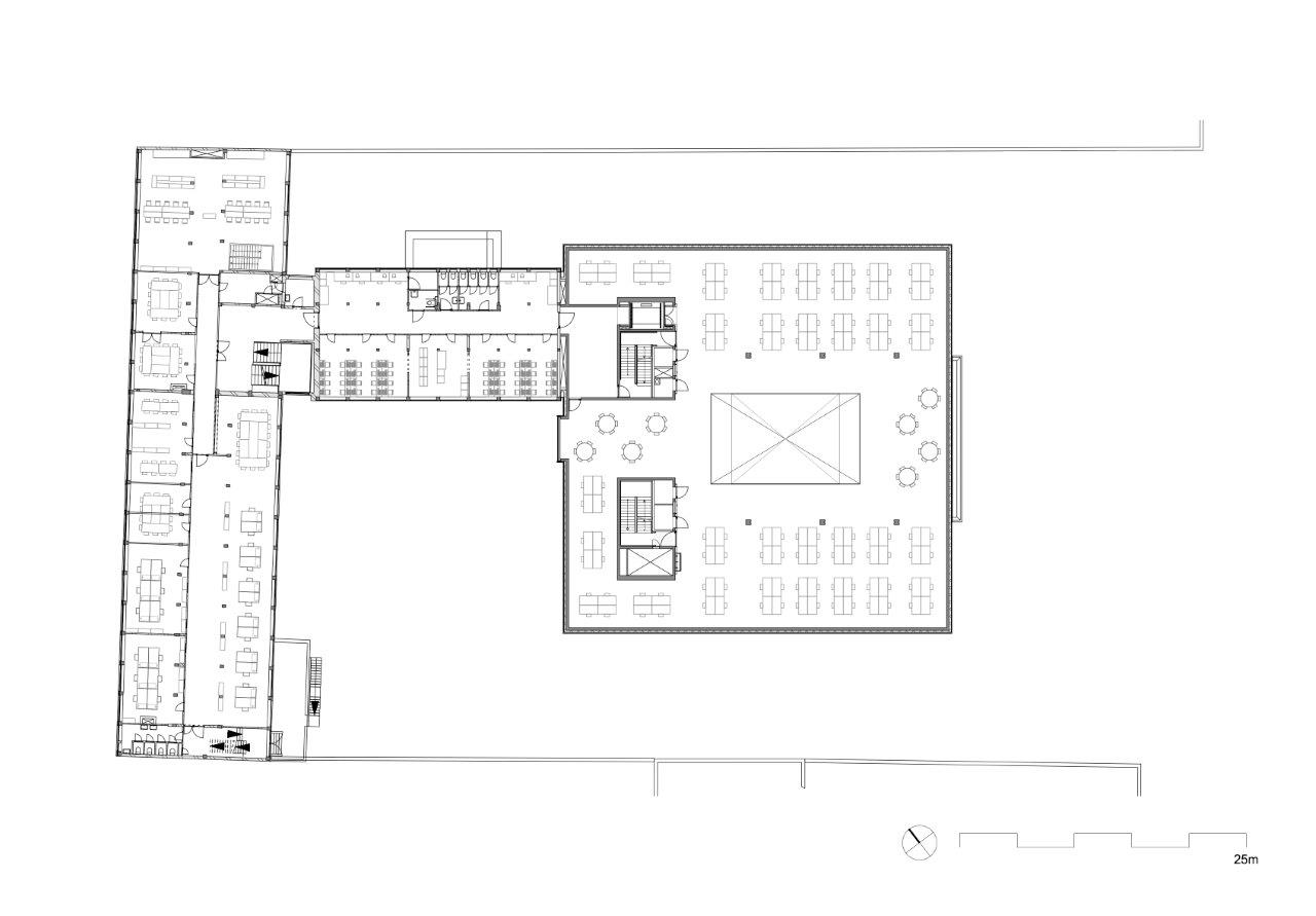 Toelichting Atelier Kempe Thill - Het uitgangspunt van het ontwerp was de transformatie van een bestaande verpleegschool uit de late jaren 50 van de vorige eeuw. Het aangename gebouw was, na bijna 60 jaar gebruik, nog steeds in goede staat, maar bood slechts kleine en inflexibele klaslokalen die onvoldoende geschikt waren voor het hedendaagse kunstonderwijs.