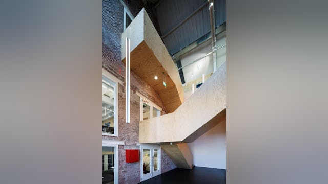 Daar waar de twee oorspronkelijke gebouwen elkaar ontmoeten, in het hart van het project, wordt een grote vide met hierin een sculpturale houten trap gerealiseerd die alle vijf niveaus zowel fysiek als visueel met elkaar verbindt. De originele gevel van de villa wordt zichtbaar en grote glazen puien en deuren geven toegang tot de vide. Om deze bijzondere ruimte te activeren zijn hier gedeelde faciliteiten in geplaatst.