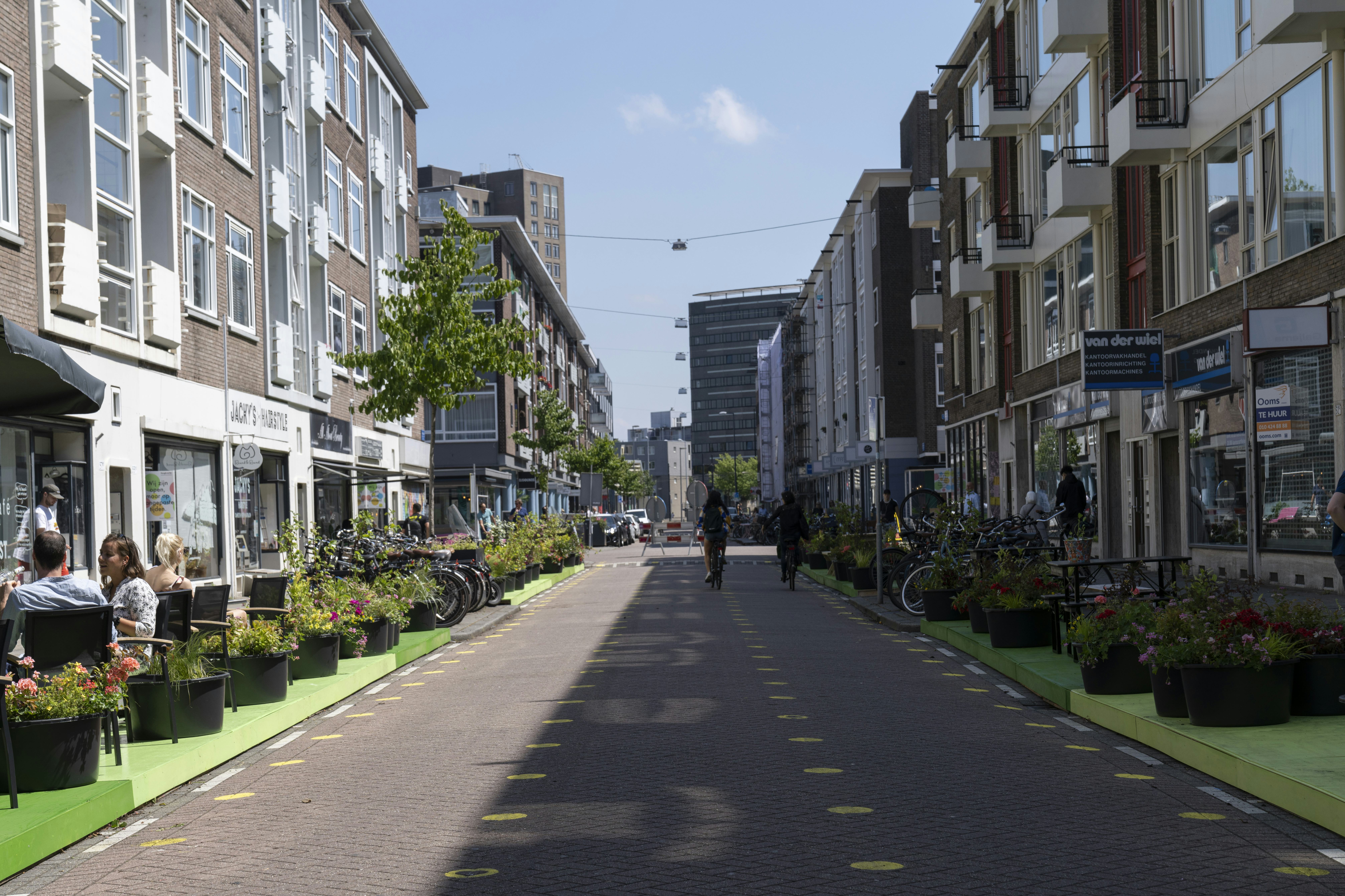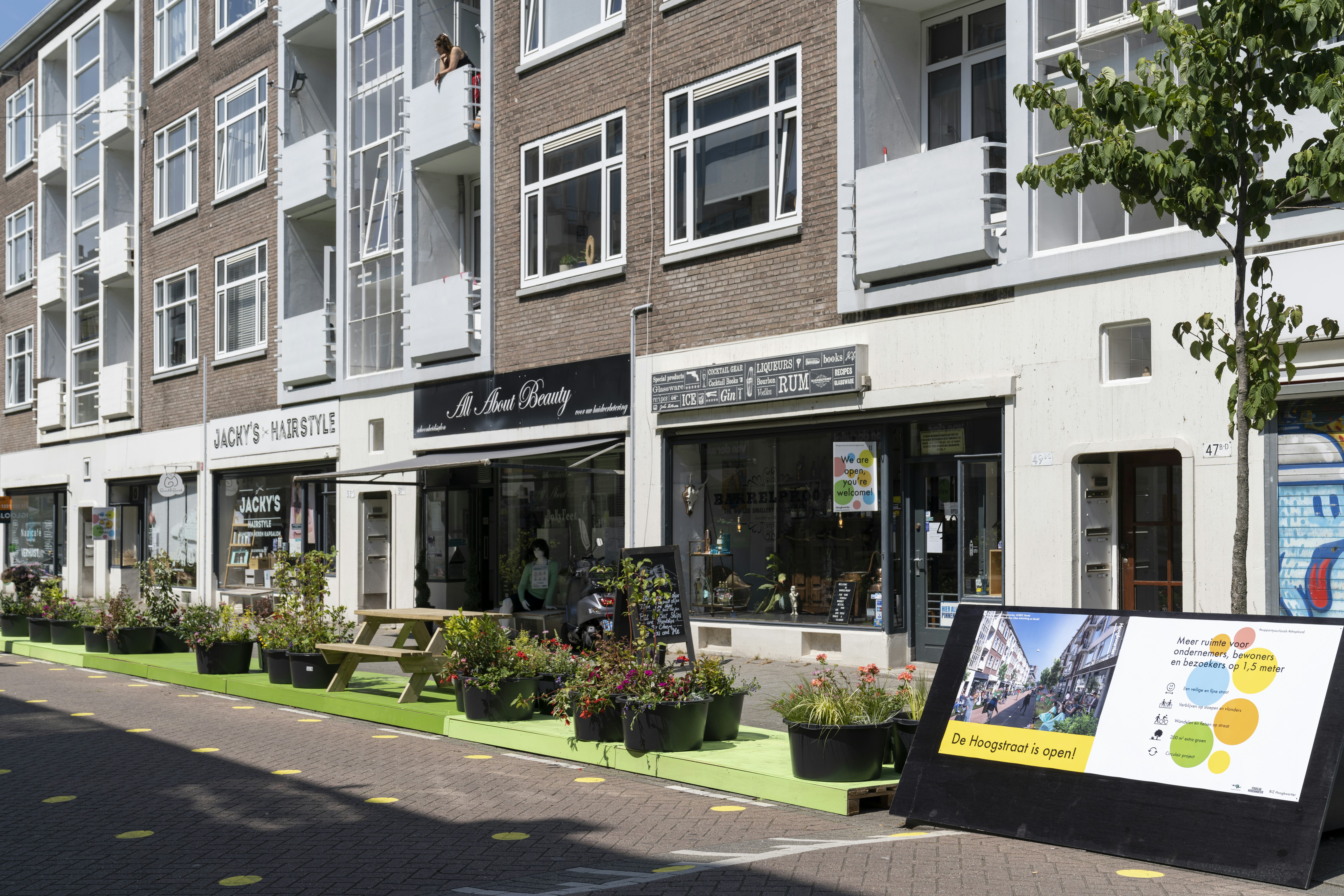 Binnen het programma ‘Rotterdam geeft de ruimte’ krijgen ondernemers tijdelijk meer ruimte. De stoepen op de Hoogstraat zijn te smal om de 1,5 meter afstand aan te houden of de terrassen uit te breiden. Er is een plan gemaakt waarin ook bewoners meer ruimte krijgen om deze zomer te genieten van hun straat. Het project wordt gefaseerd uitgerold. Het deel Hoogstraat tussen Kipstraat en Goudsewagenstraat is nu gereed. Daarna wordt geëvalueerd met de buurt om vervolgens ook het deel tot Oostplein te transformeren.