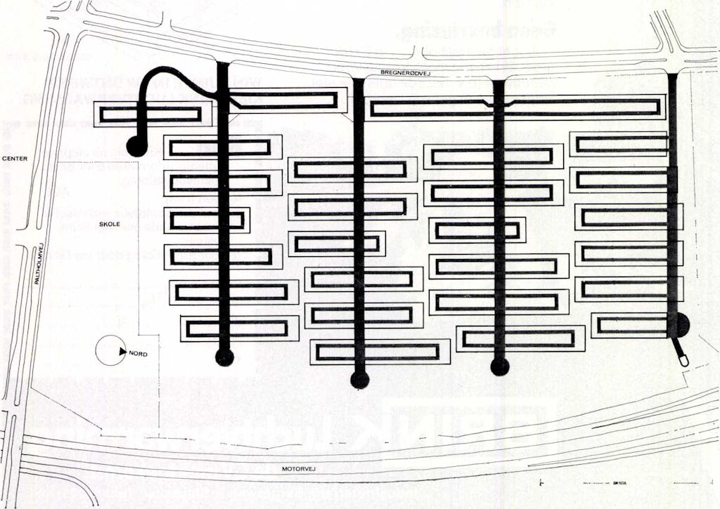 Aan de noordzijde van Farum, ruim 20 km boven Kopenhagen, stond een ongeveer rechthoekig terrein ter beschikking. De lengte- as van deze rechthoek is noord-zuid gericht en de oostelijke begrenzing wordt gevormd door een autoweg. Op dit terrein zijn de 1360 woningen gerealiseerd in 24 woonblokken en 3 blokken die ook nog andere activiteiten herbergen. Al deze blokken hebben hun lengteas ook noord-zuid. In dwarsdoorsnede zijn de woonblokken - vier rijen van zes - trapeziumvormig.