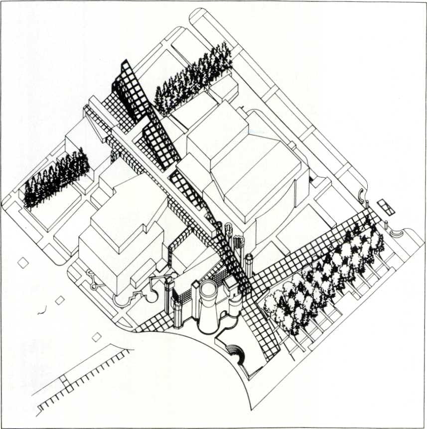 Wanneer je via de hoofdweg Columbus uitrijdt zie je tussen twee oude panden een witte rasterstructuur uitrijzen. Het decor-effect hiervan wordt nog versterkt door enkele in rode baksteen opgetrokken torenfragmenten aan de linkerzijde van het grid. Dwars op de hoofdweg ligt een met vierkante tegels geplaveid voetpad naar de entree van het gebouw. Links van het voetpad bevindt zich een verdiept veld met een plaveisel dat onderling verschoven rasters toont. Op de kruispunten van deze rasters staan bomen. Van dichtbij blijkt het er aanvankelijk als een decor uitziende grid een belangrijke passage te zijn die een zekere perspectivische vertekening vertoont doordat de hele structuur schuin omhoog loopt.