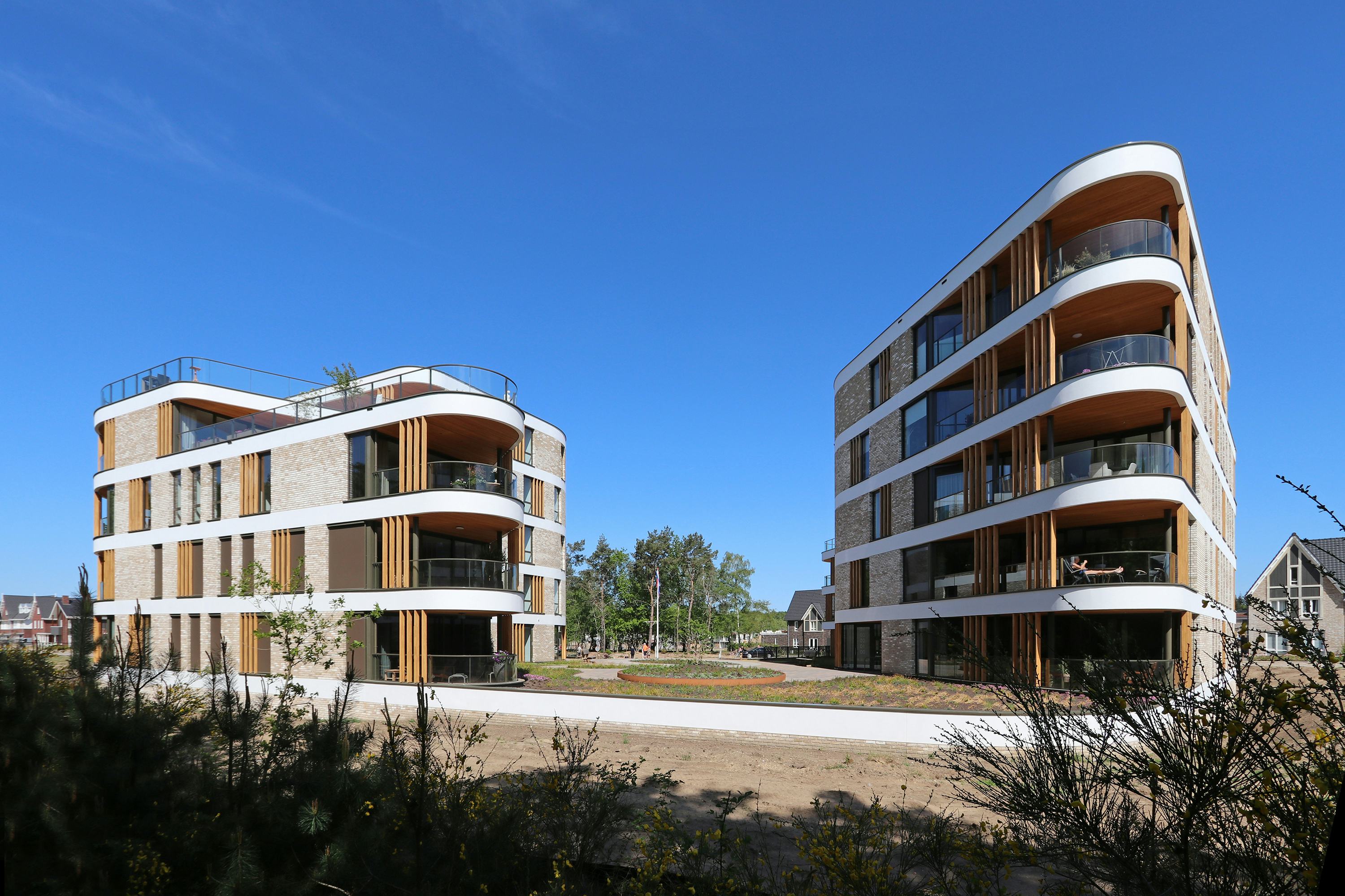 De afgeronde vormen en vloeiende lijnen verzachten de contouren, waardoor het park ontspannen langs en tussen de gebouwen door vloeit. Elk appartement ligt aan een afgeronde hoek, zodat je vanuit iedere woonkamer vrij uitkijkt op het omliggende groen dat zo kenmerkend is voor deze locatie. De aansluitende, meerzijdige terrassen vormen als bijzondere buitenkamer vervolgens de ultieme schakel tussen woning en natuur. Het heldere lijnenspel met de vloeiende, organische vormen wordt doorgezet in de plint van het gebouw. Vanuit het park loopt het maaiveld tussen de gebouwen schuin omhoog. Dit nodigt uit om het terrein te betreden.