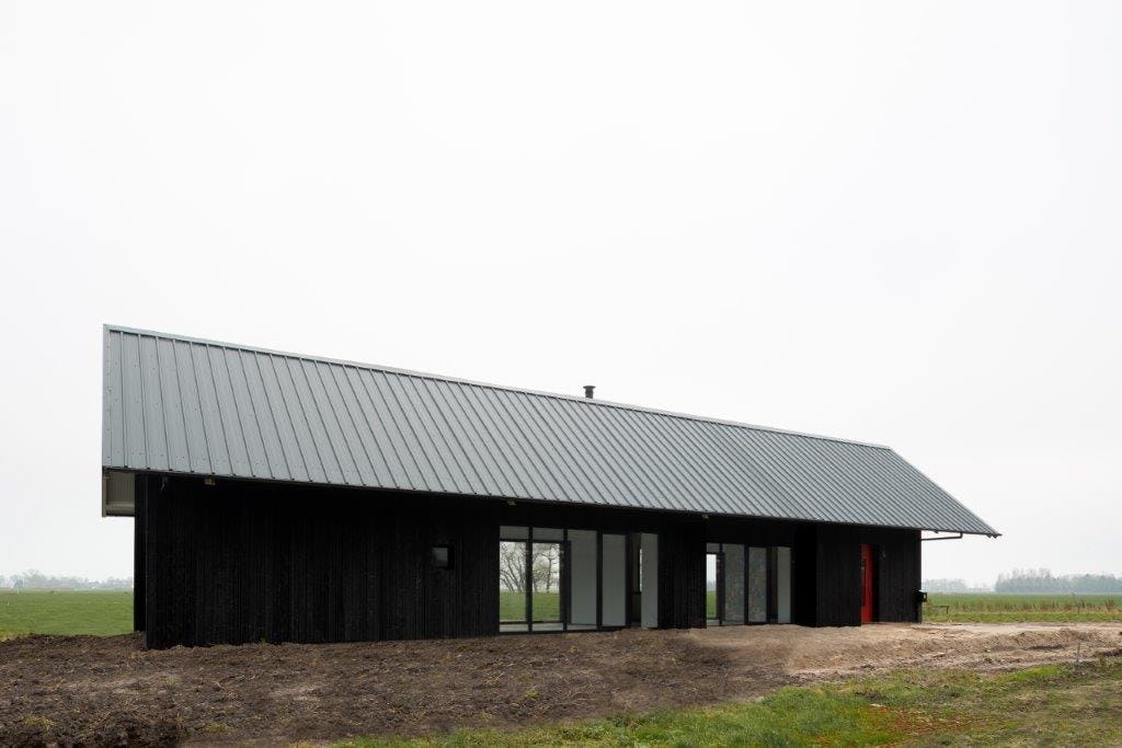 De keuze om een zwarthouten gevelbekleding toe te passen is mede geïnspireerd op de traditionele schuren uit de omgeving waarvan er velen zijn afgewerkt met zwarte houten latten. De recentere schuren uit de omgeving zijn vaak in de gevel- en dakafwerking van stalen golfplaten voorzien. In het ontwerp van schuurwoning V wordt de afwerking in hout en stalen golfplaten gecombineerd. Door dit beide in zwart te doen, manifesteert het woonhuis zich als een duidelijke eenheid in het groene landschap.
