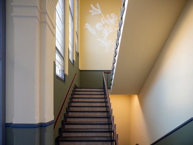 Transparantie is ook de essentie van de nieuwbouw, die aan het bestaande kloostercomplex is toegevoegd. Dit tussenmotief verbindt de losstaande historische bouwdelen met elkaar en in die zin vormt de nieuwbouw een ‘knoop’. De knoop organiseert de routing binnenin het gebouw en voorziet het complex tegelijkertijd van drie nieuwe entrees. Daarmee vervult de nieuwbouw niet alleen een interne logistieke functie, maar creëert ook een stedenbouwkundige verbinding met de omgeving.