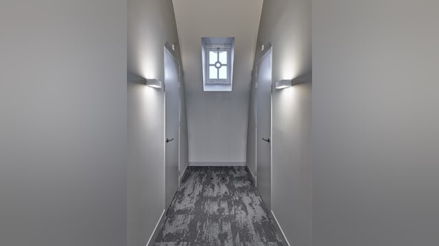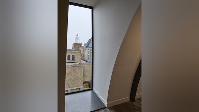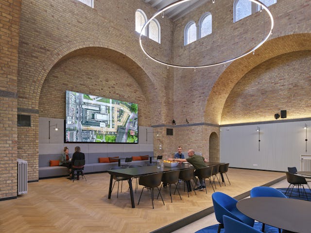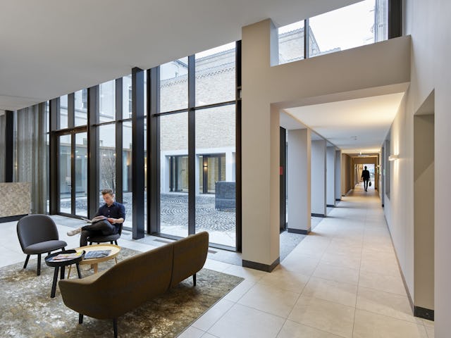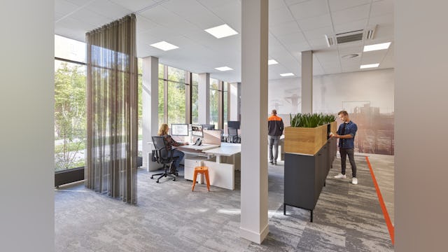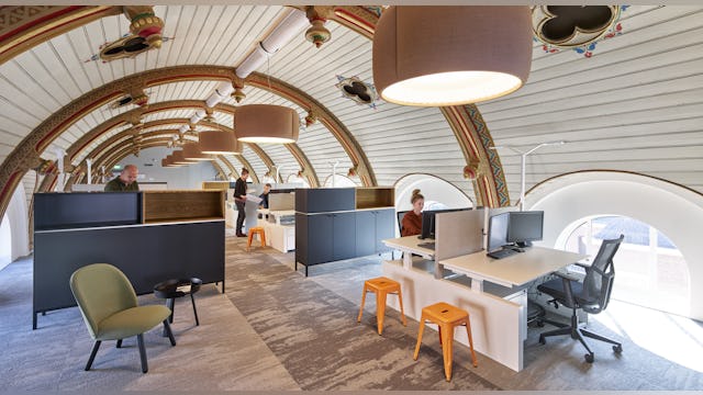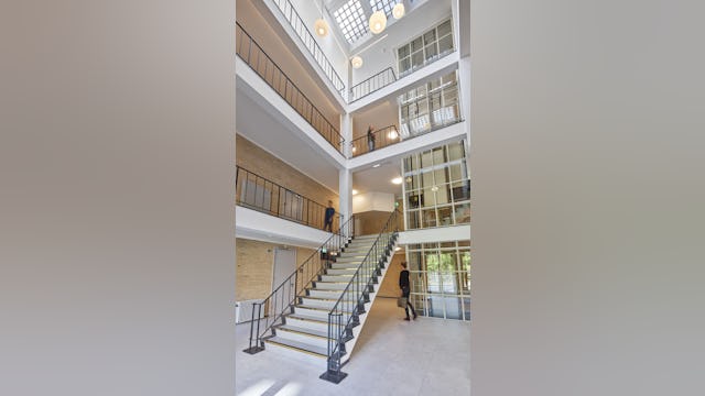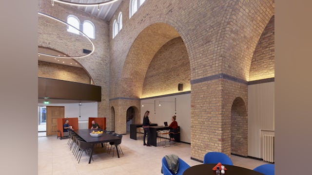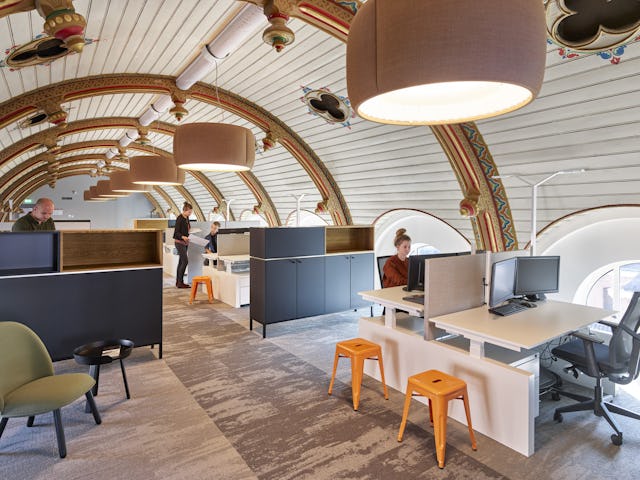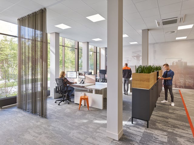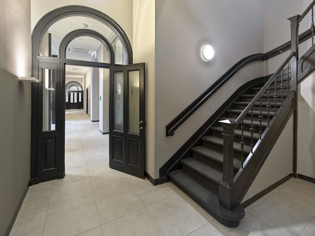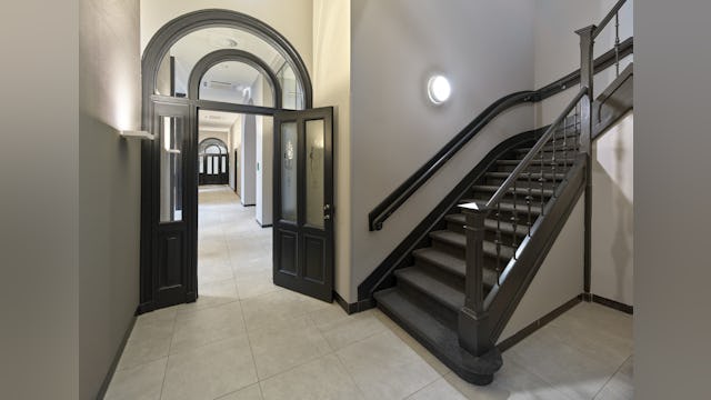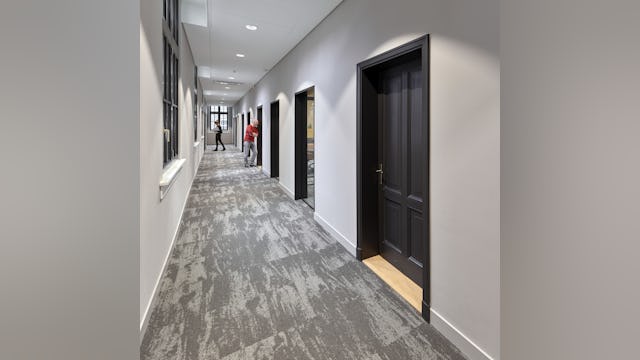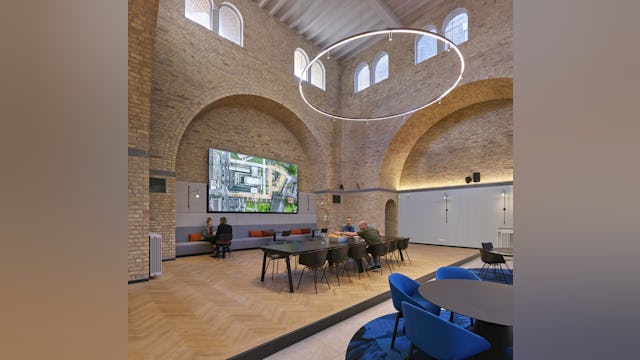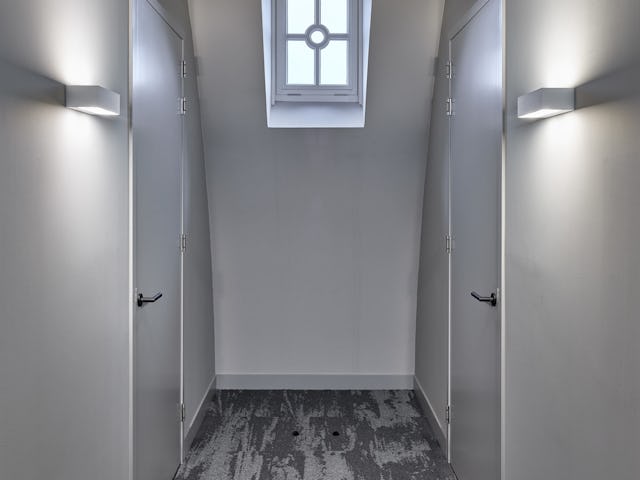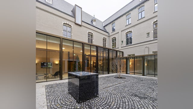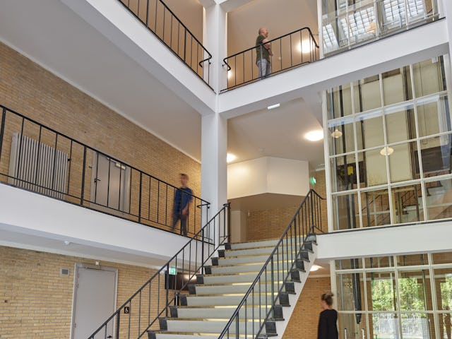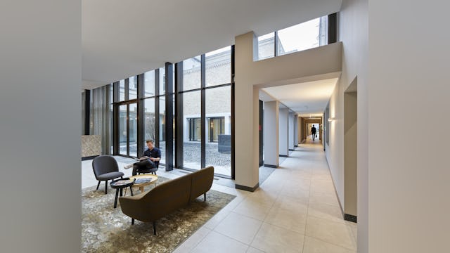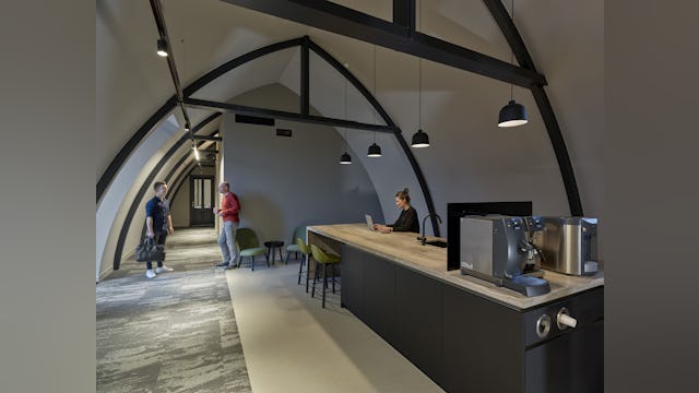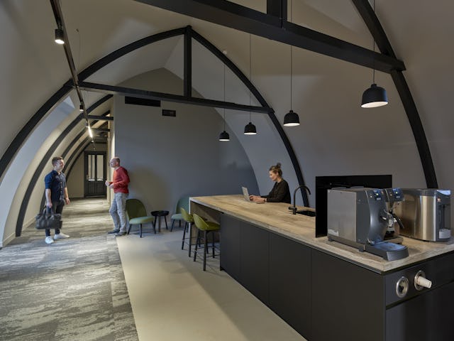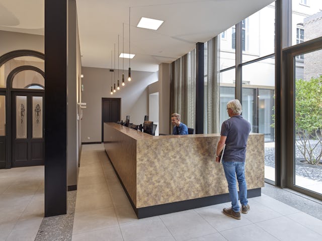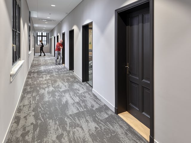 Ook in het interieur wilden we dat je ervaart dat je niet in een standaard kantoorgebouw werkt, maar in een bijzonder pand waarvan je de historie daadwerkelijk kunt voelen. Ook hier zijn oorspronkelijke details zorgvuldig hersteld, op sommige plekken opnieuw zichtbaar gemaakt en vervolgens gecombineerd met eigentijdse interieurelementen en moderne voorzieningen, zodat een wandeling door het gebouw een tijdreis wordt door de gelaagdheid van de rijke geschiedenis van dit prachtige pand.