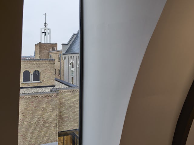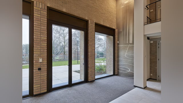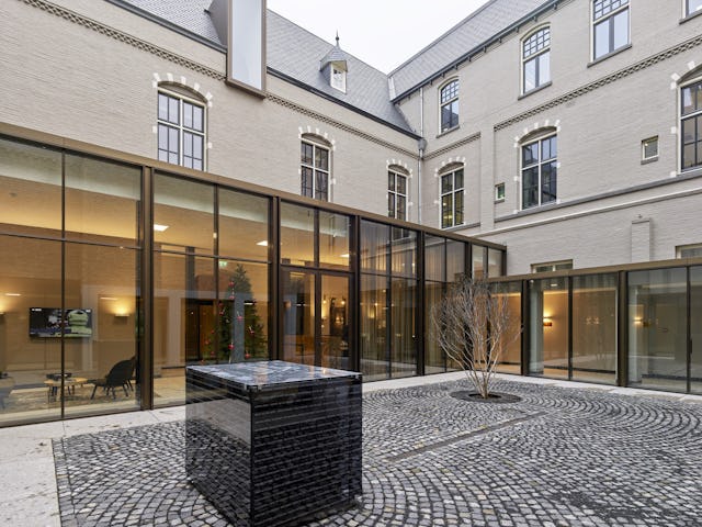 Toen wij werden gevraagd om het ontwerp te maken voor de grondige renovatie en uitbreiding van het gehele pand, hebben we geprobeerd om een logische volgende stap te zetten in de ontwikkeling van het complex. We hebben er daarom bewust voor gekozen om alle delen die nieuw werden aangebouwd op een herkenbare, eigentijdse manier vorm te geven. De nieuwe kloostergang aan de patio en de glazen uitbreidingen aan de achtergevel en de linker zijgevel, zijn daarom allemaal op een eenduidige manier opgetrokken uit ranke, brons geanodiseerde aluminium vliesgevels. De nieuwe gemetselde delen aan de achterzijde zijn in een baksteen opgetrokken die nauwelijks te onderscheiden is van de oude bouwdelen uit de Bossche School-tijd, maar door ze in een tegelverband te metselen zijn ze in tweede instantie toch duidelijk herkenbaar als eigentijdse toevoegingen. De eenheid tussen de drie bouwstijlen is verder gezocht in de vormgeving, de ritmes en de zorgvuldige detaillering. Samen met Berghege en haar onderaannemers hebben we consciëntieus gewerkt aan een verfijnde vormgeving van de nieuwe gevels.