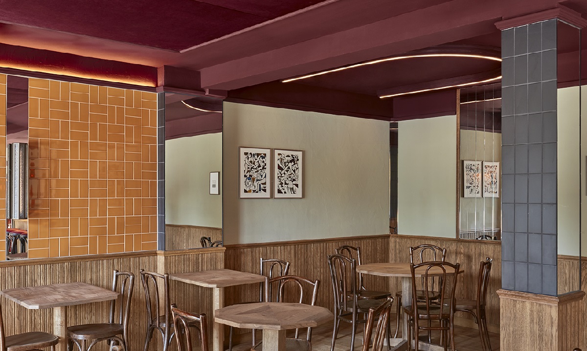 Buiten worden gestreepte luifels in de kleuren zwart, grijs, wit en paars versierd met grote lichtslingers, met vintage getextureerde wandlampen en gouden bladlogo's op de grote ramen die bijdragen aan de ouderwetse café-sfeer. Een groter terras dat iets van het gebouw af is geplaatst, wordt omsloten door op maat gemaakte windschermen en plantenbakken - hun ontwerp herhaalt opnieuw details van het interieur.