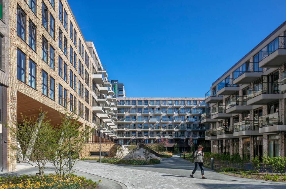 Toelichting door arons en gelauff architecten - Het principe van het bouwblok van Zuidblok is dat we een aantal afzonderlijke gebouw typologieën hebben ingezet om de massaliteit en anonimiteit die veel van dit soort complexen kenmerken te vermijden. Corridors, galerijen en portieken zonder liften en als afsluiting een gebouw met een binnenhof, zijn ingezet om het verschil in woonvormen te benadrukken. Het bouwblok bestaat daarmee eigenlijk uit een reeks ‘panden’ met ieder een eigen karakteristiek.
