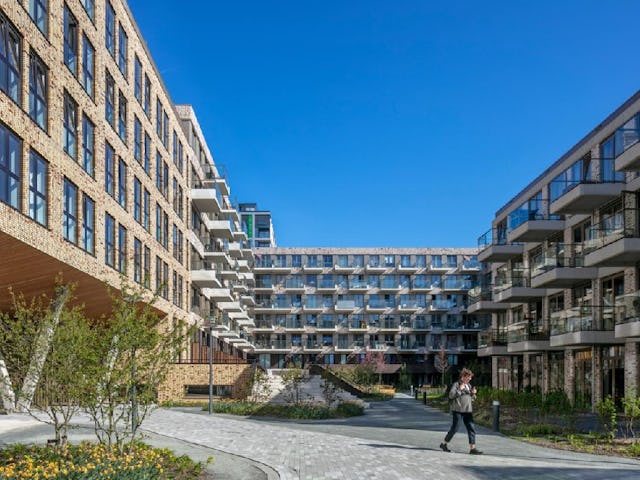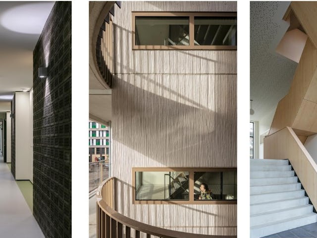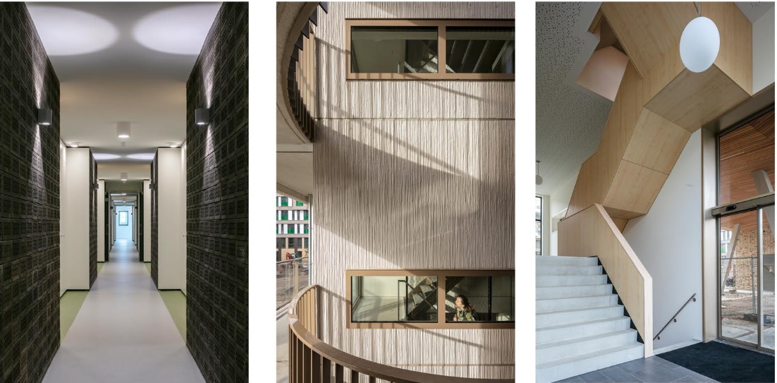 In de woningen is slapen en wonen slim gecombineerd. Dankzij 1,5 extra hoogte kon boven de badkamers een slaapkamer/ruimte worden gecreëerd, afgescheiden van het woongedeelte. Ook in het interieur van de algemene ruimten zijn extra middelen ingezet om het tot een duurzaam en prettig complex te maken. De relatief lange corridors hebben we ritme gegeven door te verbreden bij de woningtoegangsdeuren.