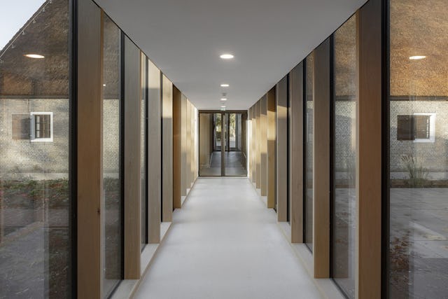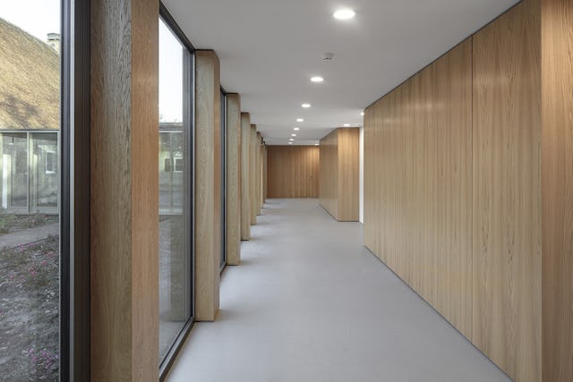 Vanaf de gezamenlijke ruimtes in de boerderij loopt een glazen gang naar het nieuwe gebouw met de gastenkamers. De ervaring van het groen, de natuur en het licht staat hier centraal. Daarom heeft de gaanderij rondom de omsloten tuin veel glas. Houten kolommen, houten wanden en kasten geven de ruimte een duidelijk ritme.
