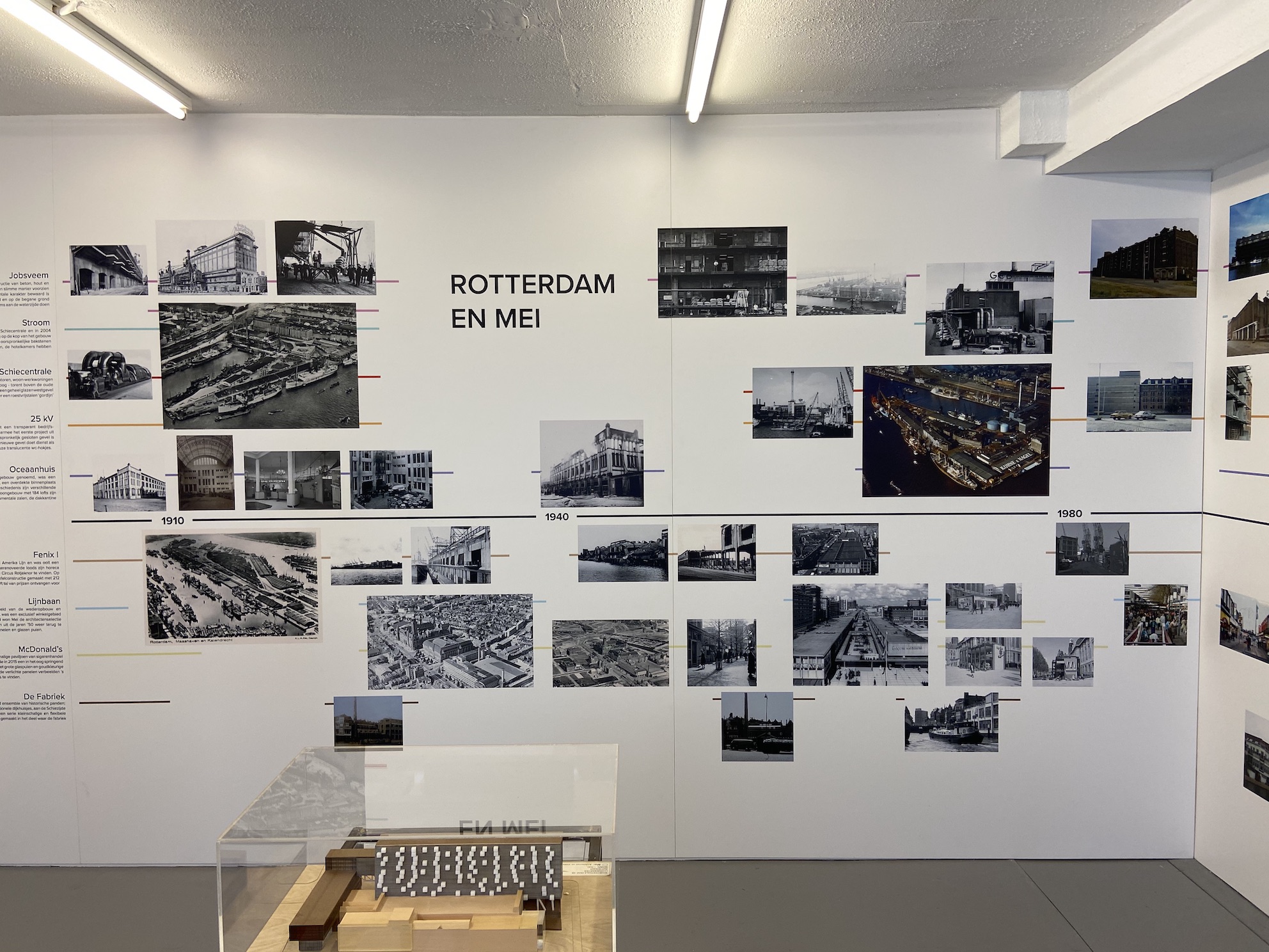 In het OMI opende afgelopen week de tentoonstelling ‘Mei en Rotterdam’, een tentoonstelling waarin werk van Mei Architecten is samengebracht. De tentoonstelling bestaat uit enkele maquettes, een tijdlijn waarin de projecten van Mei zijn ondergebracht en op fors formaat geprinte foto’s van Ossip van Duivenbode. In de tijdlijn worden de projecten gespiegeld aan de geschiedenis die aan de meeste gebouwen vooraf ging. De foto’s van Ossip tonen een nieuwe kijk op de architectuur van Mei.