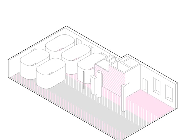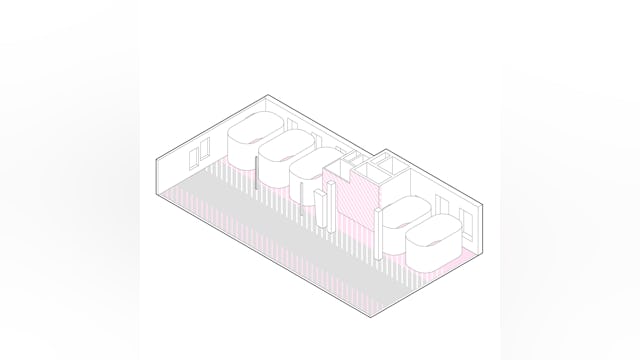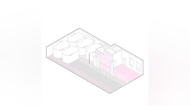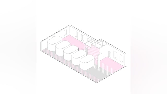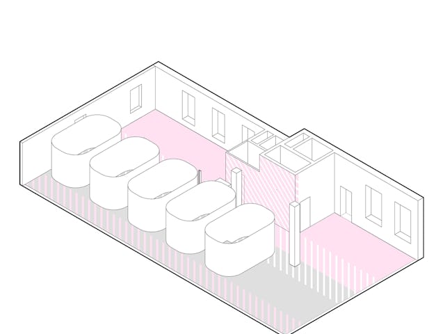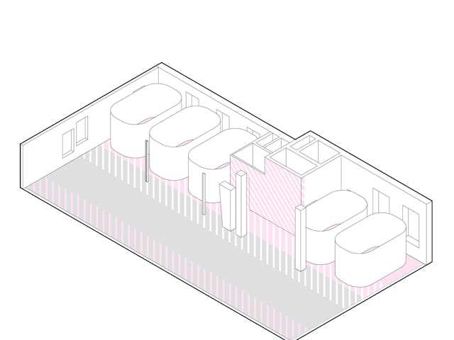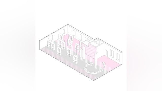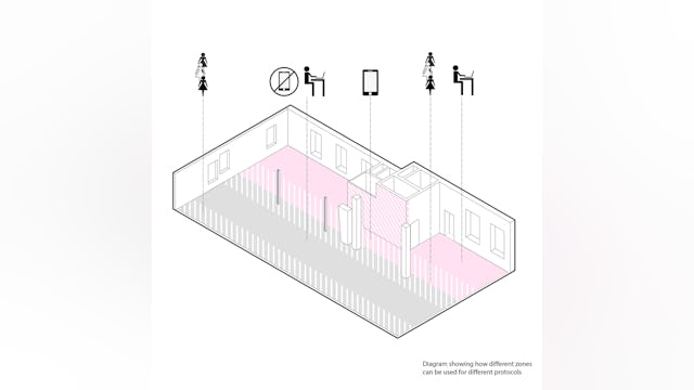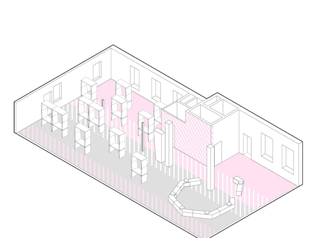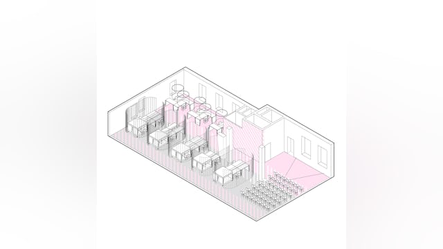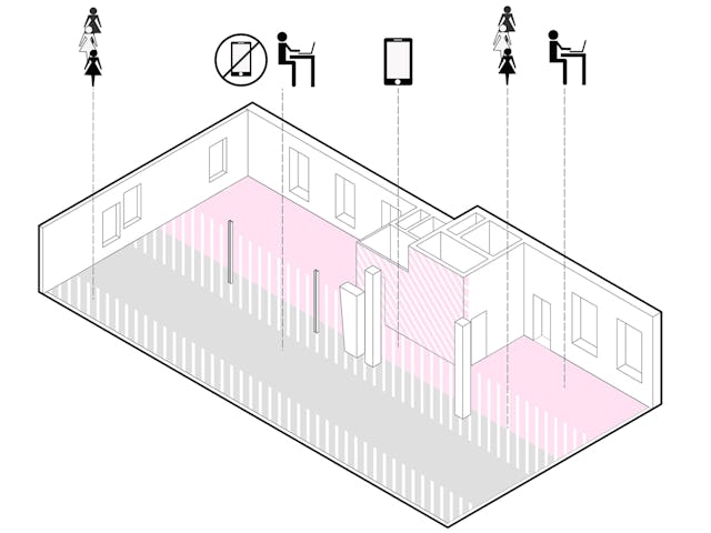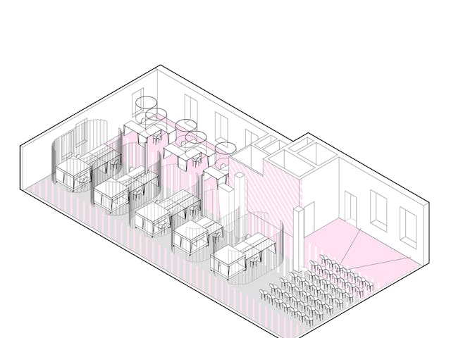 ” Zowel het traditionele klaslokaal, als de standaard werkruimte zouden niet voldoen aan de nieuwe leeromgeving. Ingebed in De Wasserij, een verzamelgebouw voor kleinschalige modebedrijven, zou de ruimte plek moeten bieden aan productiewerk, breakout- en brainstormsessies, maar ook voor lezingen en discussies die door het platform zullen worden georganiseerd. De studenten, waarvan sommige moeite met concentreren hebben, moeten zich kunnen terugtrekken, zonder zich af te zonderen uit de grote ruimte. En boven op deze eisen kwam een nieuwe urgentie: de vraag hoe om te gaan met veiligheid in de Covid-19 crisis.