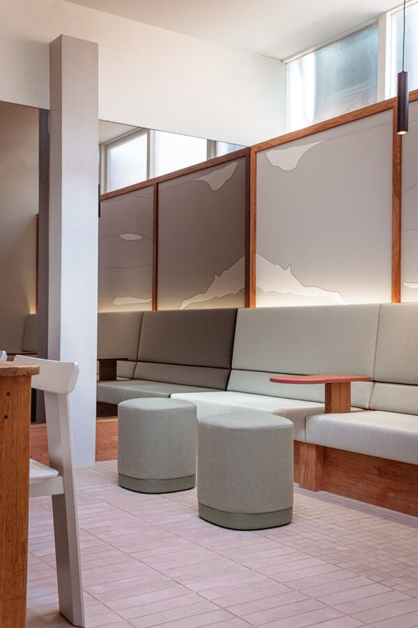 In Koekela hebben we de ruimte gegeven aan onze textiel- en meubelontwerpers: zij hebben het interieurontwerp tot een hoger niveau getild. Wandpanelen decoreren de winkel en doen denken aan geabstraheerde deeglagen. Deze grootformaat borduurwerken hebben behalve een esthetische werking ook akoestisch nut en zijn gevuld met geluidsabsorberend foam, waardoor een driedimensionaal effect ontstaat.