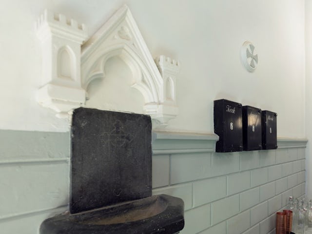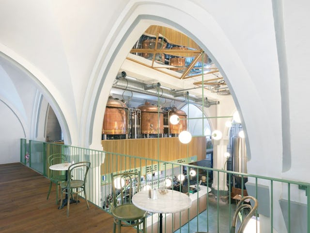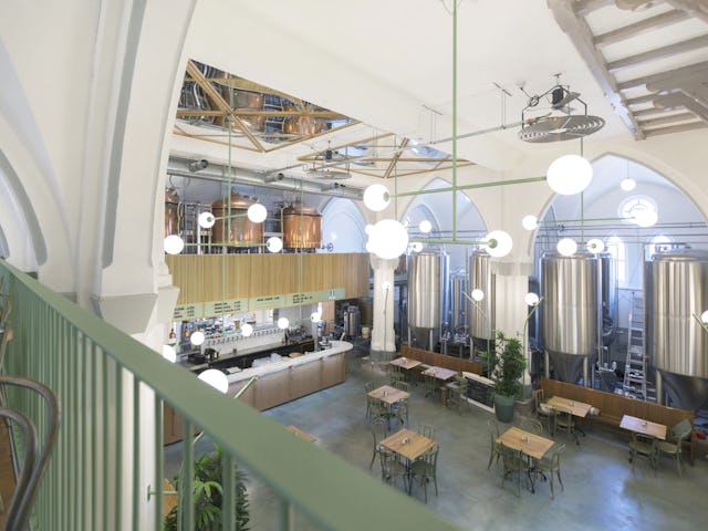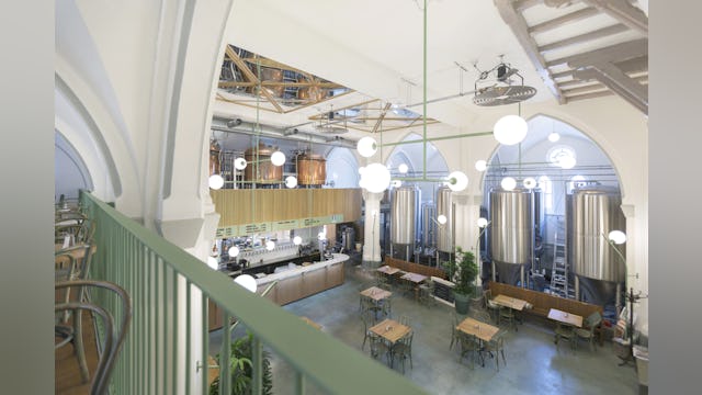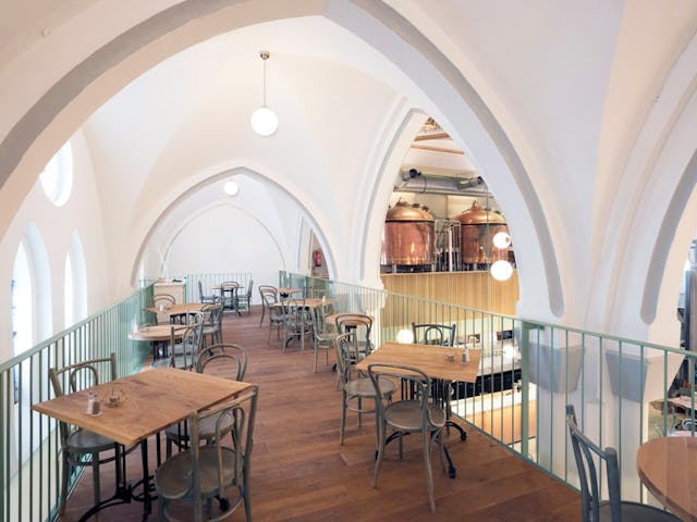 Direct bij binnenkomst valt de bar op op die als een hedendaags altaar voor een lichte marmeren tapwand is geplaatst. De koperen brouwketels zijn hierboven op een nieuw entresol gepositioneerd en hellen een klein beetje over de bar heen. Door middel van spiegels zijn de oude zichtlijnen optisch gereconstrueerd. De voor dit project ontworpen verlichtingsarmaturen zijn tegen de bestaande kolommen geplaatst en lichten de boogconstructie aan. De nieuwe horeca-entresol is los tussen de bestaande bogen geplaatst en is zo rank mogelijk ontworpen om de de oorspronkelijke geleding zo min mogelijk te verstoren.