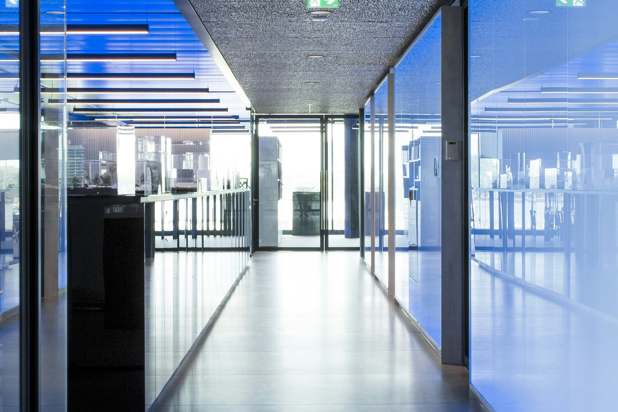 Zo zat QbiQ al in een vroeg stadium aan tafel bij The Flow in de Amsterdamse Houthavens, een ontwerp van MVSA Architects - dat er zelf ook kantoor houdt op de tweede etage. De wens om het daglicht - én het prachtige uitzicht over het IJ - niet te verstoren, leidde projectleider Jacob Sanders naar QbiQ. “We kozen voor de voltransparante glaspuien om het daglicht tot in de kern door te laten dringen. Het systeem van QbiQ oogt licht, heeft ranke profielen en niet te veel stijlen in het zicht.” Het lukte om kantoren en vergaderruimtes in te bouwen en ook te voldoen aan zware akoestische en brandwerende eisen. Zo was de kantoorvloer zo groot dat het nodig was om er twee aparte brandwerende compartimenten van te maken met een 60 minuten brandwerende wand ertussen. Zónder dat het afbreuk aan het ontwerp zou doen, uiteraard. “Het is uiteindelijk gelukt om die wand binnen hetzelfde uiterlijk te realiseren.”