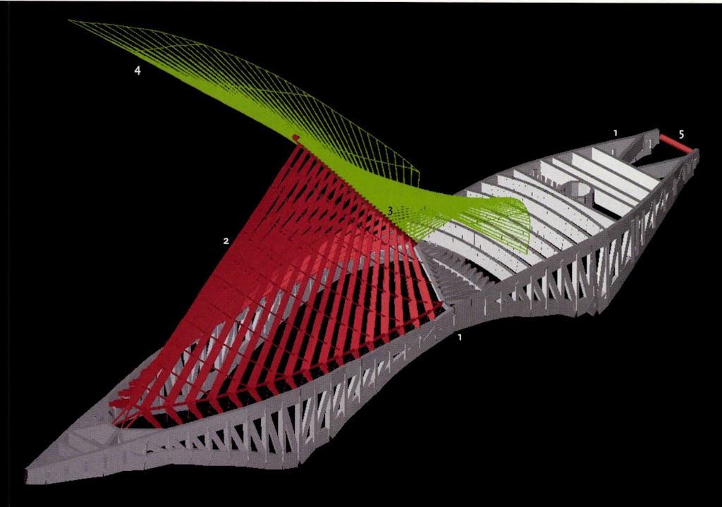 Het daklicht bovenop de ringbalk wordt ondersteund door 17 A-spanten die gemaakt zijn van stalen C-profielen. Ieder profiel verschilt licht van het volgende. Hoewel de ruggengraat en de A-spanten elkaar onder een loodrechte hoek ontmoeten, hellen ze naar elkaar over. De beweeglijke vinnen van de zonwering zijn aan de rug van het paviljoen vastgemaakt en lijken op de veren van een vogel of vliegend schip. De vlerken die kunnen ‘klapperen’ en het daklicht van schaduw voorzien, hebben een ongekende spanwijdte van 60 meter. Om de klimaatbeheersing in het gebouw een hand toe te steken, opent of sluit dit kinetische schaduwinstrument in minder dan vier minuten. Elke vleugel bestaat uit 36 ‘veren’, vastgemaakt aan twee stalen assen die op hun beurt zijn verbonden met de ruggengraat van het paviljoen. Elf paar hydraulische cilinders zetten de vinnen in beweging. Bij het openen en sluiten van het zonnescherm is veiligheid het grootste vraagstuk. Anemometers houden de windsnelheden in het oog. De besturing doet de veren sluiten wanneer de wind gedurende drie seconden of meer de snelheid van 40 km /h overschrijdt. De vinnen zouden eerst in koolstofvezel worden uitgevoerd. Dit revolutionaire materiaal combineert een hoge sterkte met een laag gewicht. De oriëntatie van de vezels kan worden gecontroleerd om waar nodig sterkte en stijfheid te bereiken. Isotropische materialen, zoals het nu toegepaste staal, hebben echter dezelfde sterkte en stijfheid in alle richtingen. Na uitgebreid onderzoek en talrijke testen van de koolstofvezel, kondigde de opdrachtgever deze lente aan dat de veren in staalplaat zouden worden vervaardigd omwille van het budget en het tijdschema.