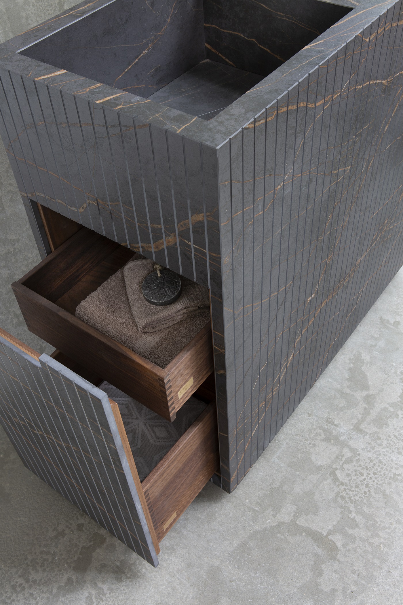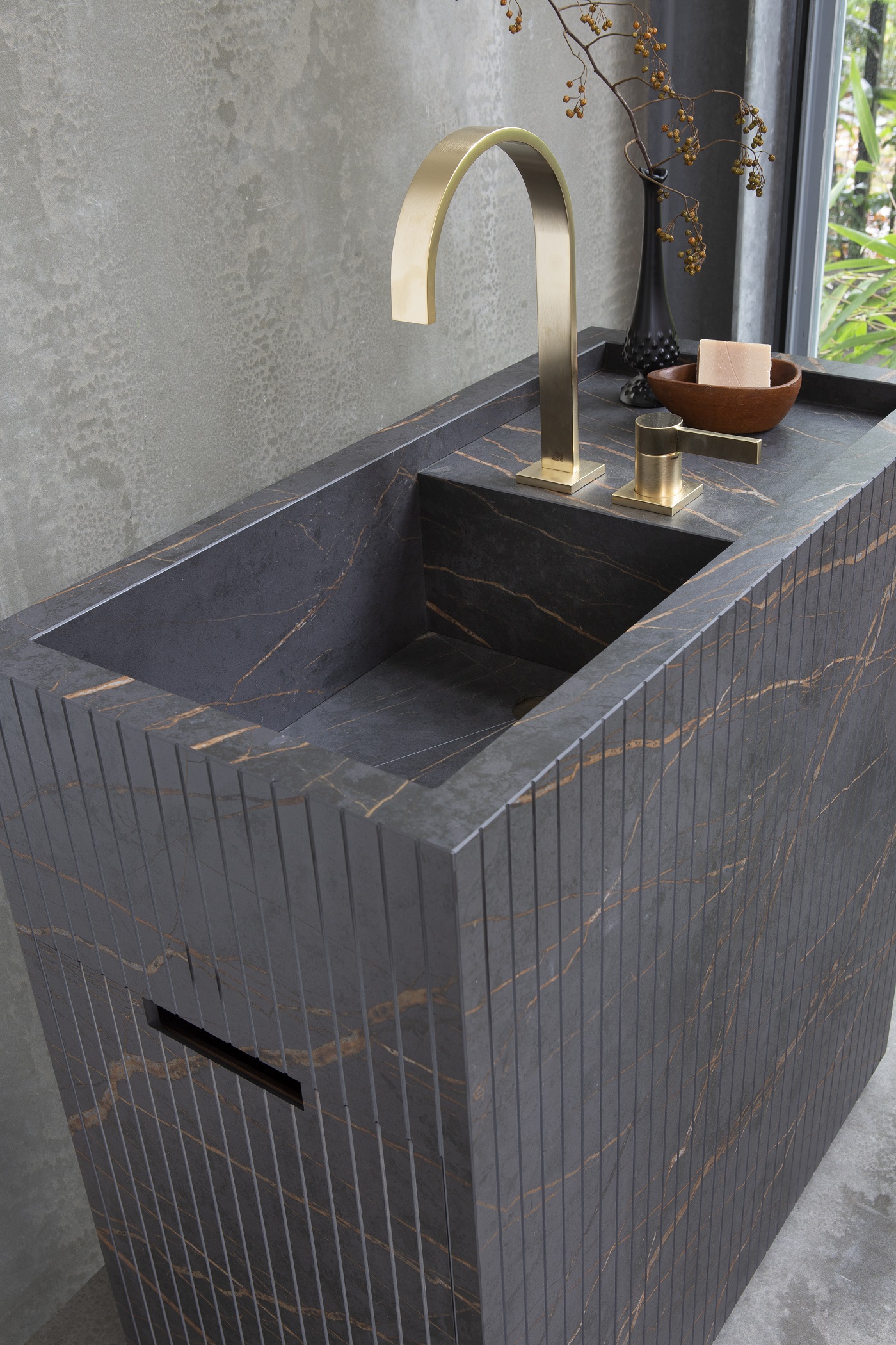 Scondido, een vrijstaand badkamermeubel volledig vormgegeven uit Dekton® by Cosentino, is ontstaan uit het idee van een solide, monolithisch blok steen. Voor dit solitaire badmeubel liet de Nederlandse ontwerper zich inspireren door het materiaal Dekton®. De krachtige uitstraling van Dekton® heeft Meijers als het ware gevangen in het ontwerp. De oervorm van een stenen blok is de basis voor dit unieke badkamermeubel dat zowel solitair in een ruimte, als duo, of als onderdeel van een rij-opstelling perfect tot zijn recht komt.