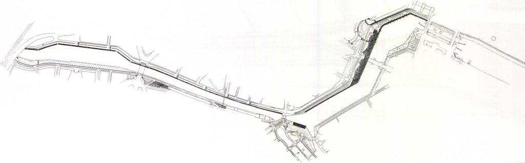 Wat betreft de vormgeving van de gewenste, meer recreatieve functie van de kade prevaleerde in de optiek van West 8 zeer sterk het gegeven van de binnenvaart. Wanneer je deze zeer druk bevaren route serieus neemt, dient de kade als kade behandeld te worden met een bijbehorend helder en eerder een stoer dan een geaffecteerd boulevard-karakter. Met de zwart-witte, stelcon-‘betegeling’, het benutten van de maximale breedte en het zo leeg mogelijk laten van de kade is hier een optimaal effect bereikt. De perfectie van de eenvoud en de weelde van de (straks) volgroeide platanen leveren daarbij evenzeer een kwalitatief hoogwaardige ambiance voor eenieder die hier verpozen wil, poedel en pitbull.