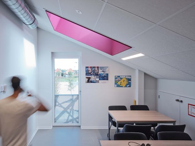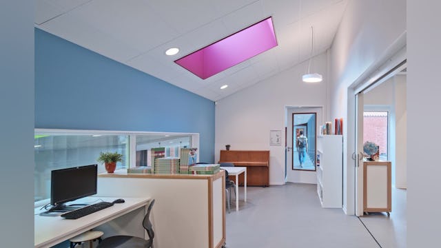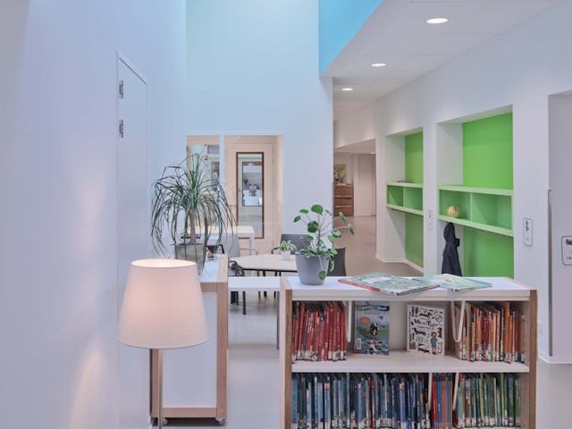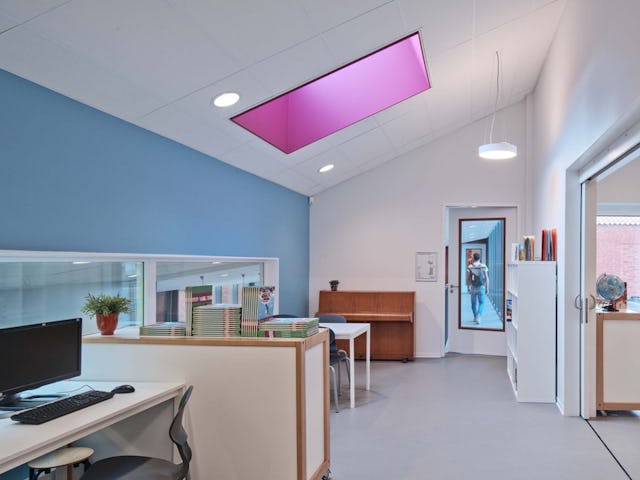 Het interieur is terughoudend met veel wit en een aantal vrolijke accenten. De plaatsing van dakramen geeft de compacte vierkante bouwmassa’s binnen een bijzondere lichtval. De indeling en vormgeving van de ruimten laten verschillende onderwijsvisies toe. Klassikaal of individueel onderwijs is door docenten zelf eenvoudig te regelen. De klaslokalen hebben brede glazen schuifdeuren en grote kastenwanden met daarin een wasbak. Het gebouw heeft een solide basisstructuur van constructie, installaties, gangen en trappen, en een flexibele indeling met lichte scheidingswanden. Een bijzonder ruimte is de verbinding tussen de twee bouwmassa’s en het ketelhuis. Dit transparante, multifunctionele tussenlid is de vitrine en het hart van het kindcentrum, gemarkeerd door de schoorsteen.