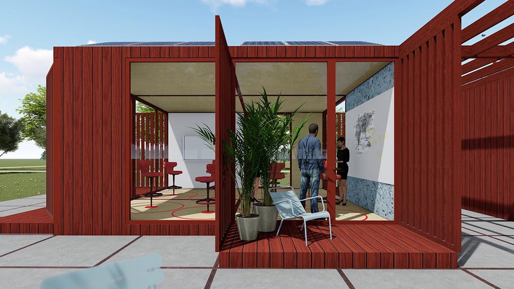 Een minstens zo kansrijk idee lijkt me het initiatief van Odette Ex van Ex-Interiors om leegstand vastgoed te transformeren naar werkplekken in fl’ex-boxen, met veel groen eromheen. Deze kantoormodules zijn flexibel, makkelijk te (de)monteren, zelfvoorzienend en bieden plaats aan een werkgemeenschap.