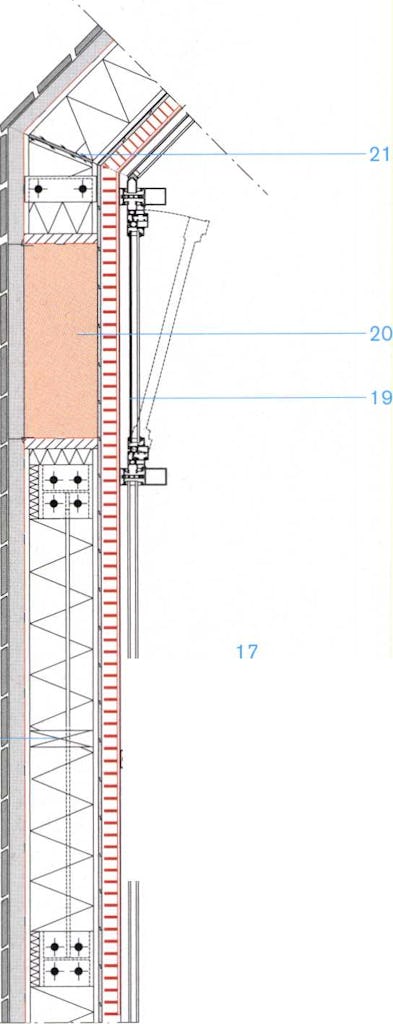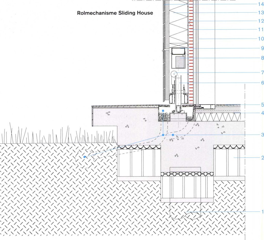 1 betonkolom; 2 isolatie (EPS met sparingen, Cordek cellcore, 300 mm); 3 afvoer regenwater; 4 vloerverwarming; 5 kwartsietvloer op zandcement; 6 kettinggedreven stalen wiel; 7 elektromotor en versnellingsbak; 8 2 accu’s (12 V); 9 profiel (150x75 mm) van het stalen frame, bekleed met hout en geïsoleerd; 10 vliesgevel glazen woonkamer (Duplus); 11 afsluitende borstels bevestigd aan het vaste gebouw; 12 binnengevel met messing en groef; 13 rubberen membraan; 14 lariks regenscherm; 15 gipsplaat; 16 aansluiting glazen woonkamer op verdiepingsvloer houten achterhuis (stalen frame in hout met isolatie); 17 eiken vloer; 18 houten invulling van het stalen frame; 19 kiepkantelraam in glazen woonkamer (Durplus); 20 raamopening in Sliding House, afgewerkt met rubberen membraan; 21 hoofddraagconstructie