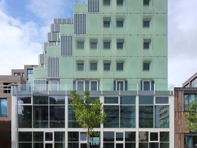 De gevel is van houtskeletbouw en aangekleed – flexibel indeelbaar - zodat de materialen na ontmanteling opnieuw te gebruiken zijn. Daarnaast werd een warmtepomp beschikbaar gesteld in plaats van dat het complex werd aangesloten op stadsverwarming. Voorwaarde was wel dat het gebouw energieneutraal moest zijn.