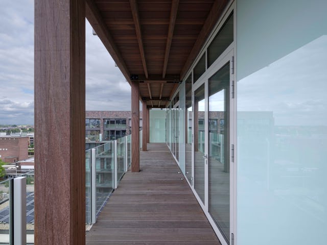 De vloeren, wanden en het plafond van de hal zijn afgetimmerd met hout. Dat geldt ook voor de balkons, de tuin en het dakterras. Al die met hout afgewerkte ruimtes zijn een warme prettige tussenwereld, de overgang tussen het leven binnen en buiten het gebouw.