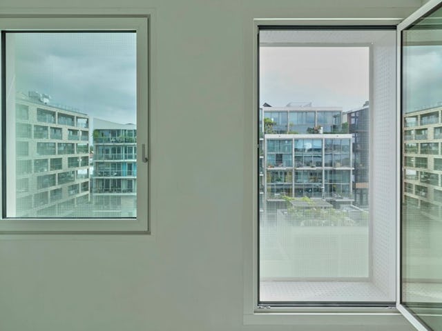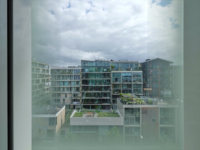 Op de balkons na, kreeg het hele gebouw een tweede huid: een extra glazen gevel, met een open spouw. Gezeefdrukte panelen zorgen voor diverse gradaties van wit naar transparant. De wisselende patronen verzachten de hardheid van het materiaal en zorgen voor een melkachtige abstractie, die van het gebouw niet meer onthult dan de vage contouren. Wat zich achter de gevel afspeelt blijft onscherp en ongrijpbaar.