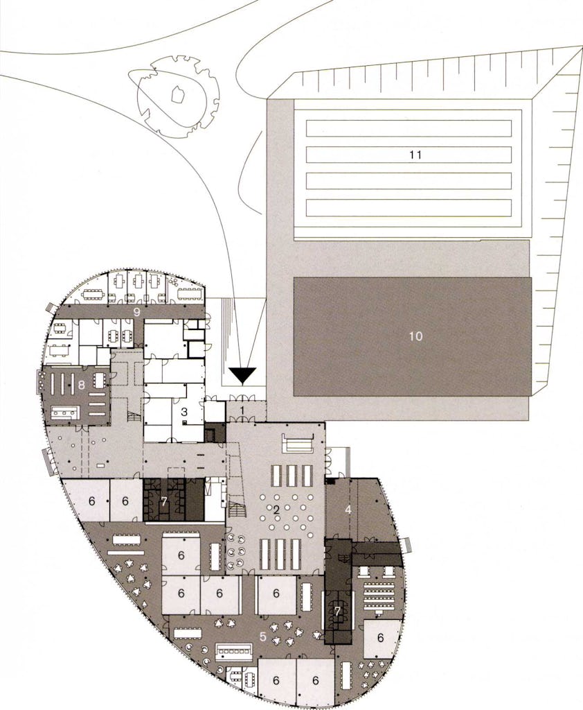 1 entree; 2 centrale hal; 3 cafetaria; 4 toneelruimte; 5 studielandschap; 6 lokaal; 7 toiletten; 8 bibliotheek; 9 ondersteunende diensten; 10 toekomstige sporthal; 11 toekomstige fietsenstalling; 12 muzieklokaal ;13 oefenruimte;14 beeldende vormlokalen; 15 practicumlokalen; 16 kantine docenten; 17 dakterras