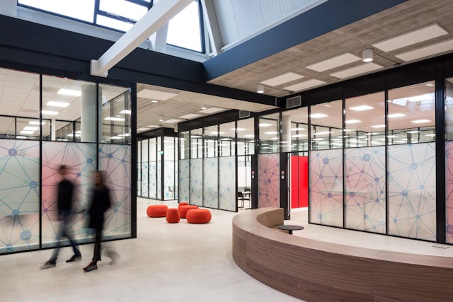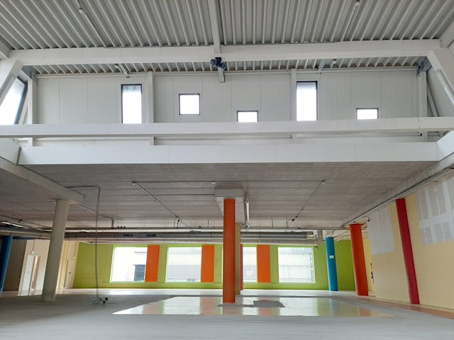 Een andere typische eigenschap van winkels, de relatief grote vrije hoogte, is ook te volste benut. In het geval van ’t Circus was dit maar liefst 4,5 meter. De nieuwe gangwanden zijn volledig in glas uitgevoerd. De onderste helft van de wanden is afgedekt met speciale folies, om in de lokalen niet teveel afgeleid te worden. De folies verwijzen eveneens naar de gebruiker, de ICT studierichting. Boven zijn alle wanden geheel in helder glas, ook de scheidingswanden tussen de lokalen. Dit verleent de ruimten een welkome openheid en transparantie.